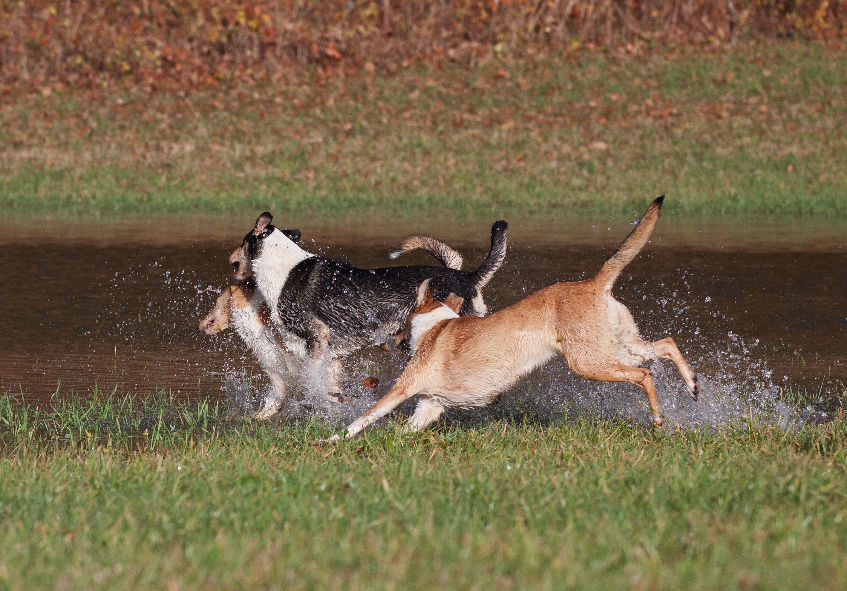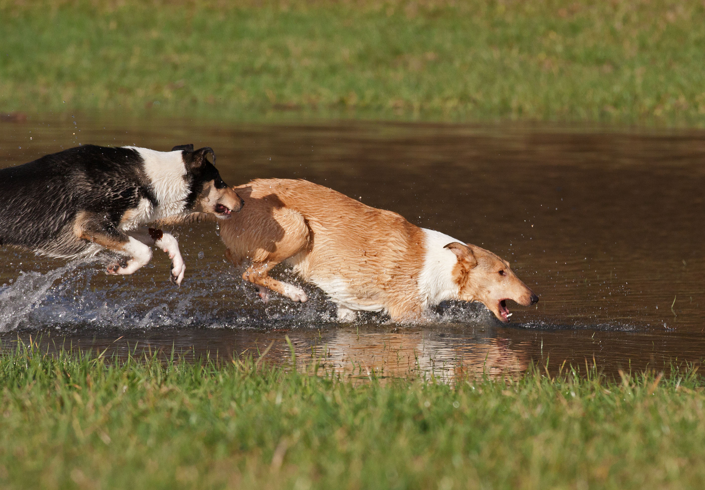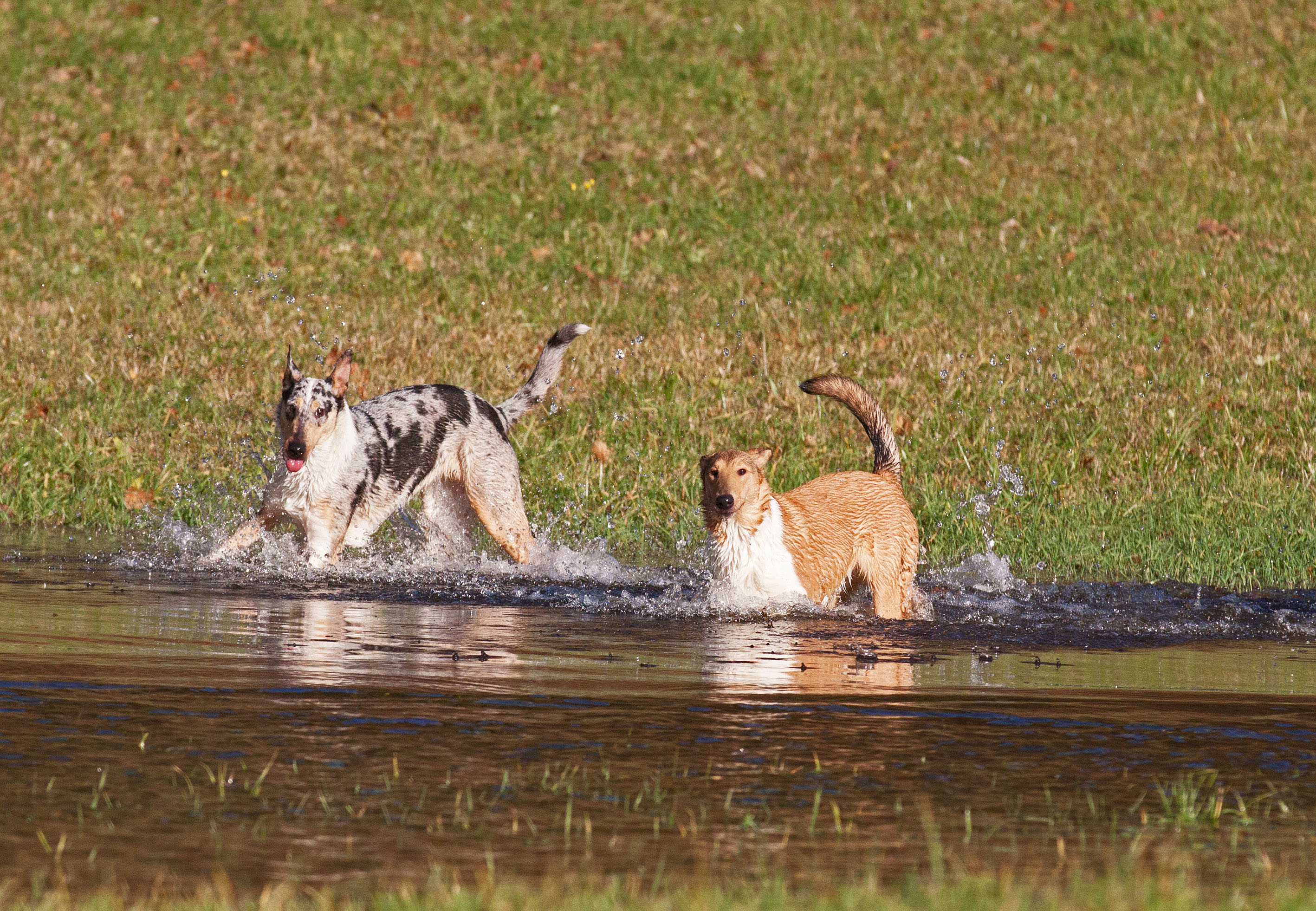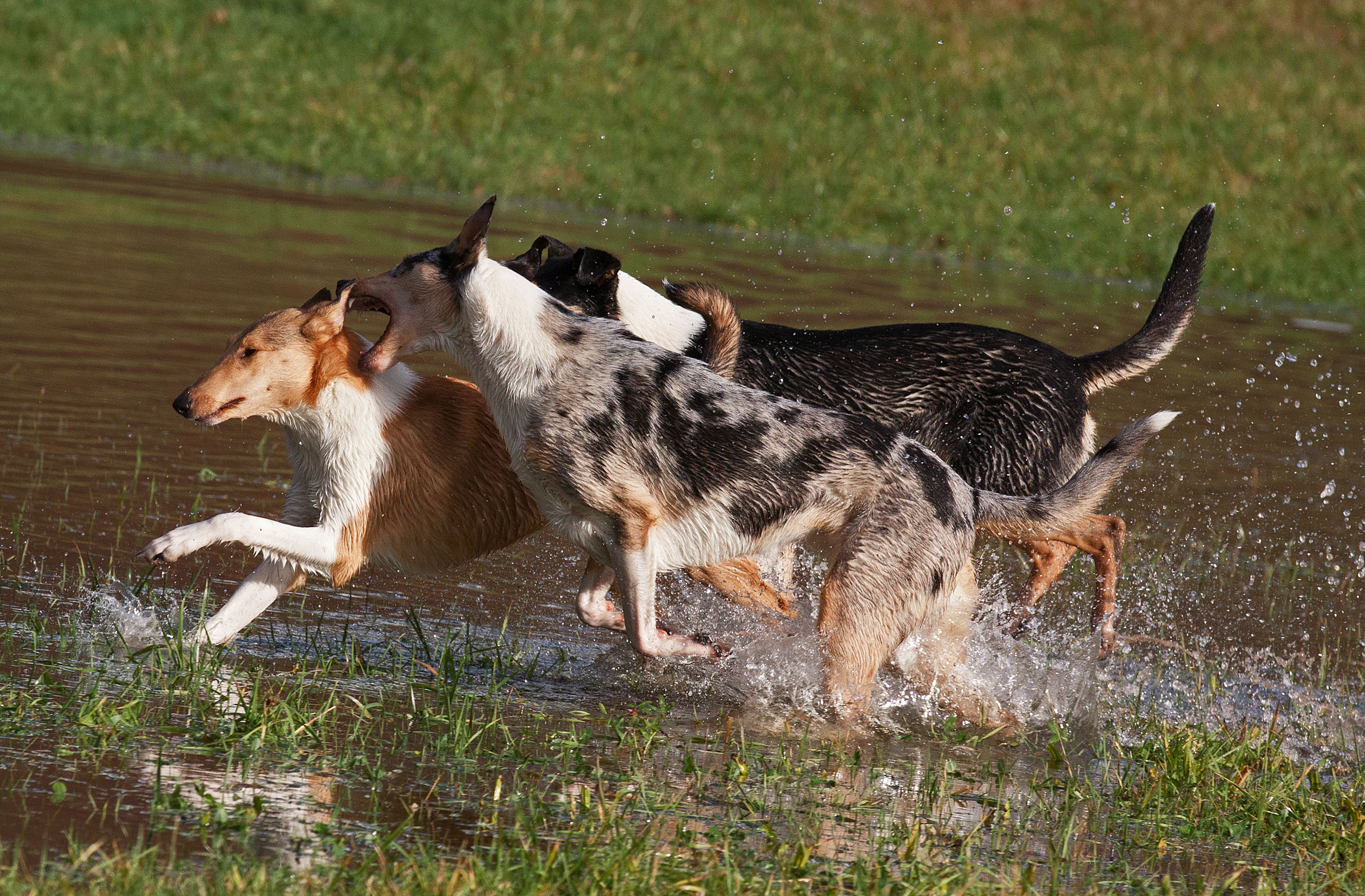 Auf der Wiese hat sich ein kleiner Teich gebildet und die Hunde,