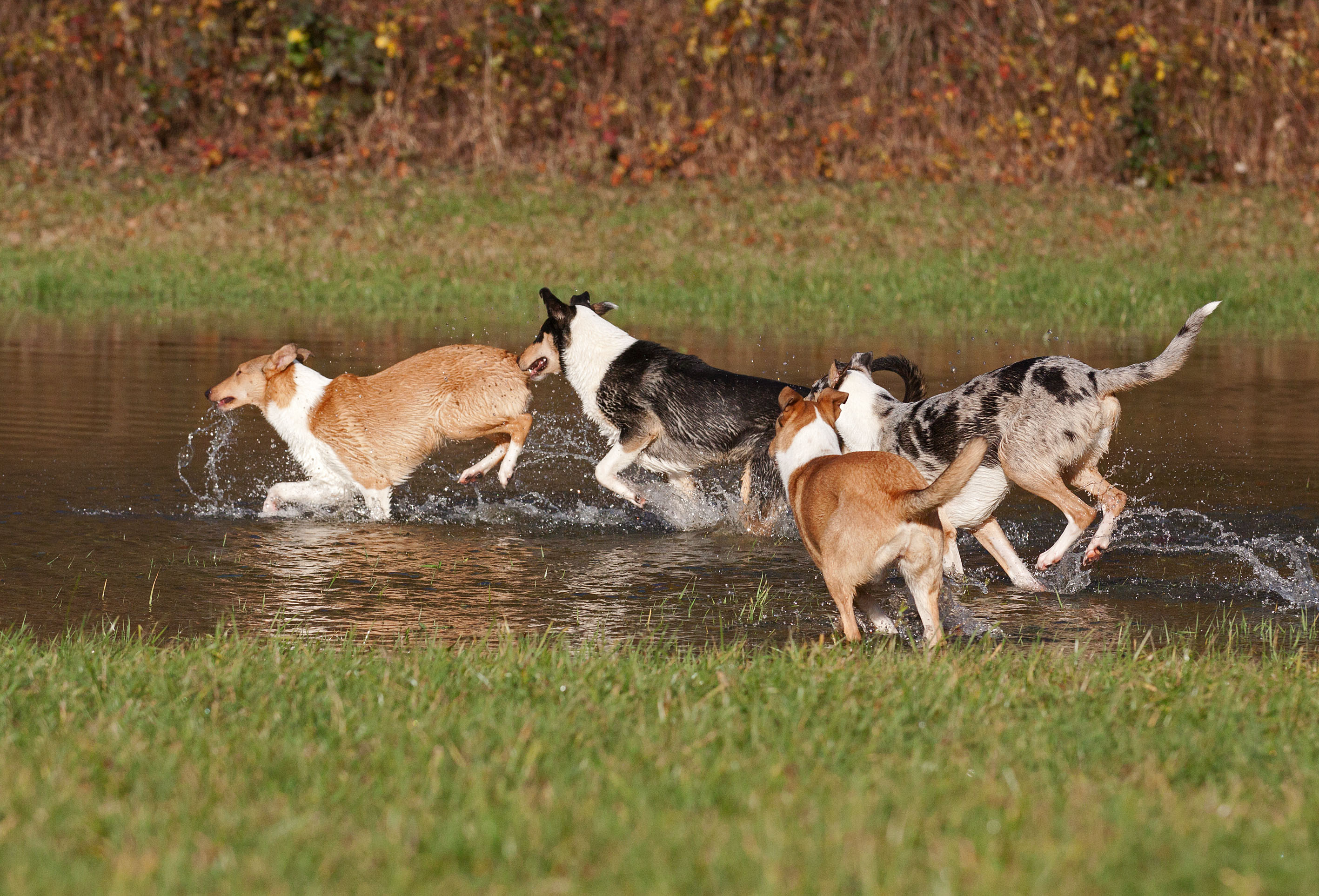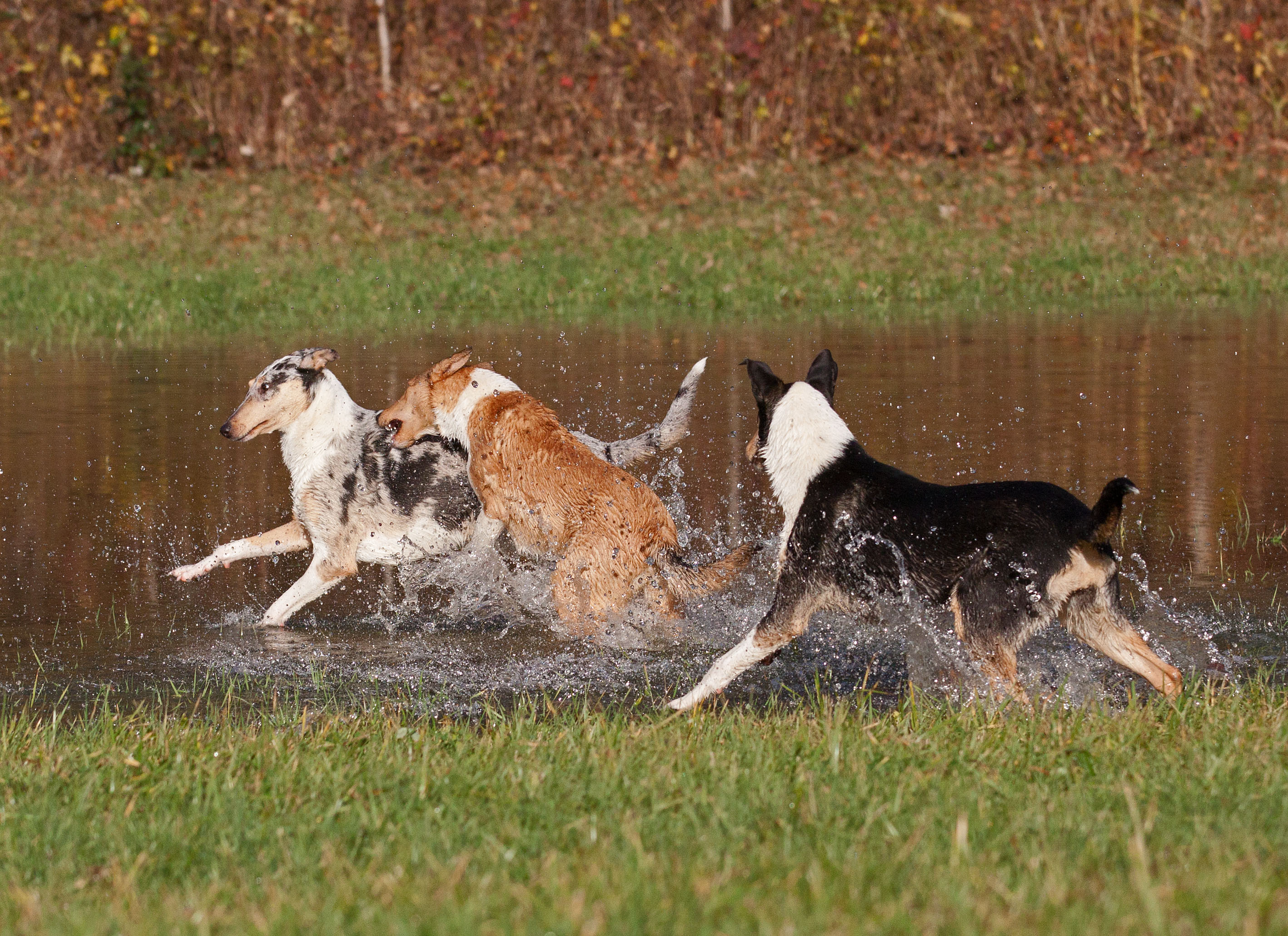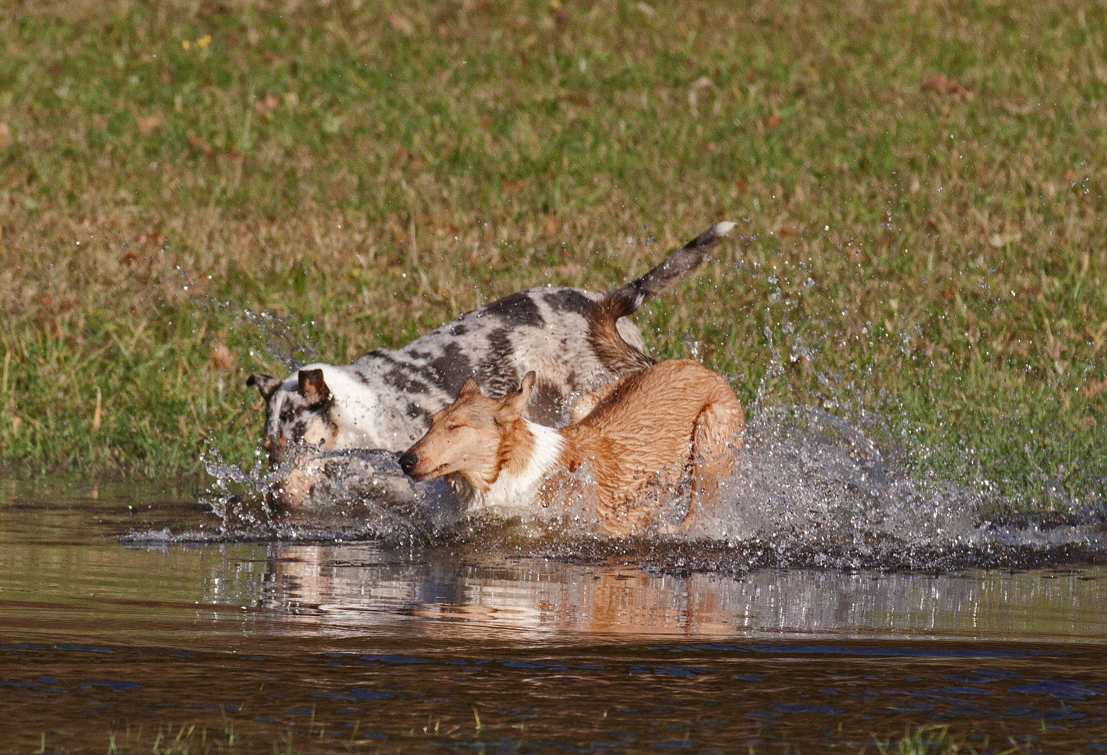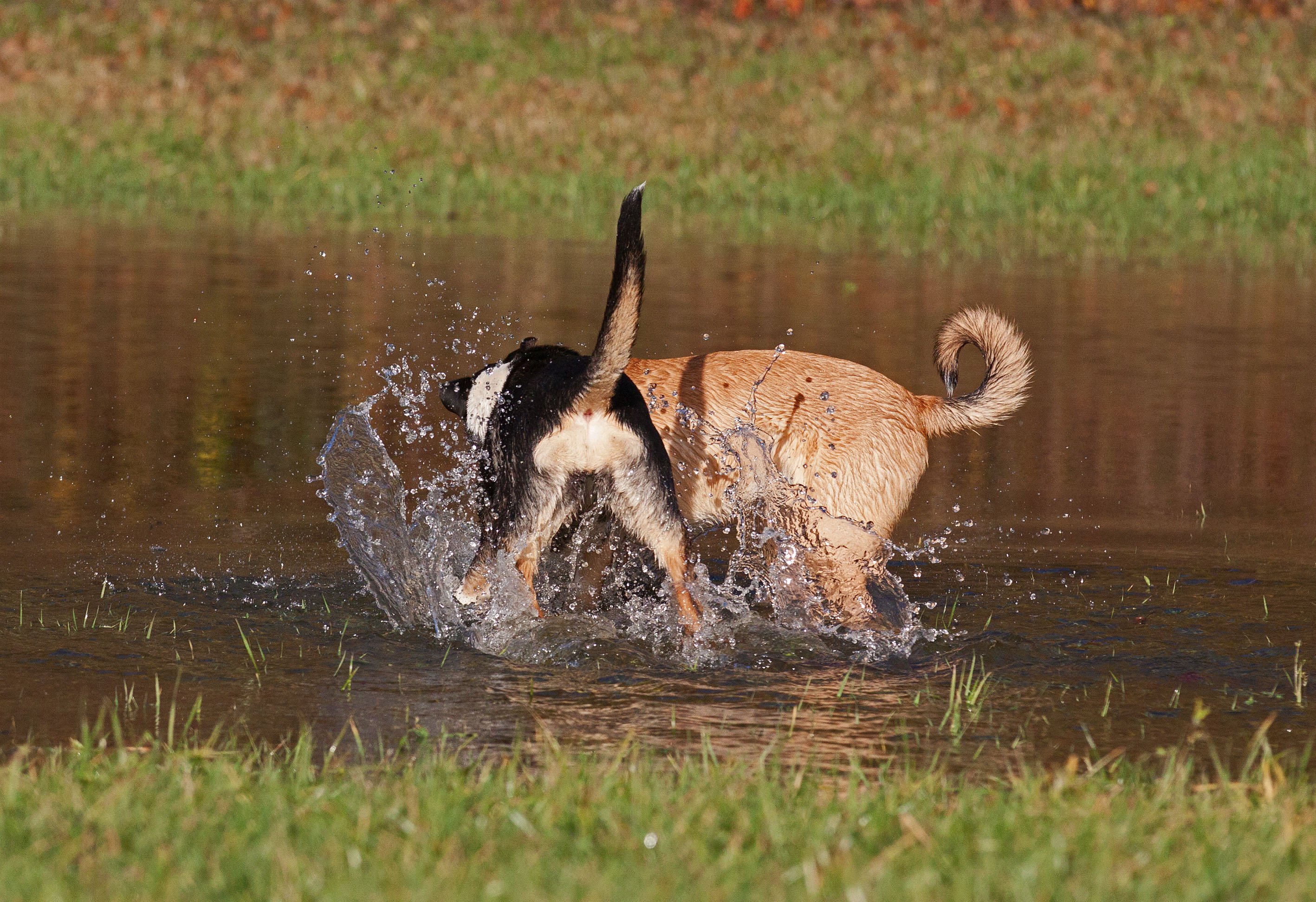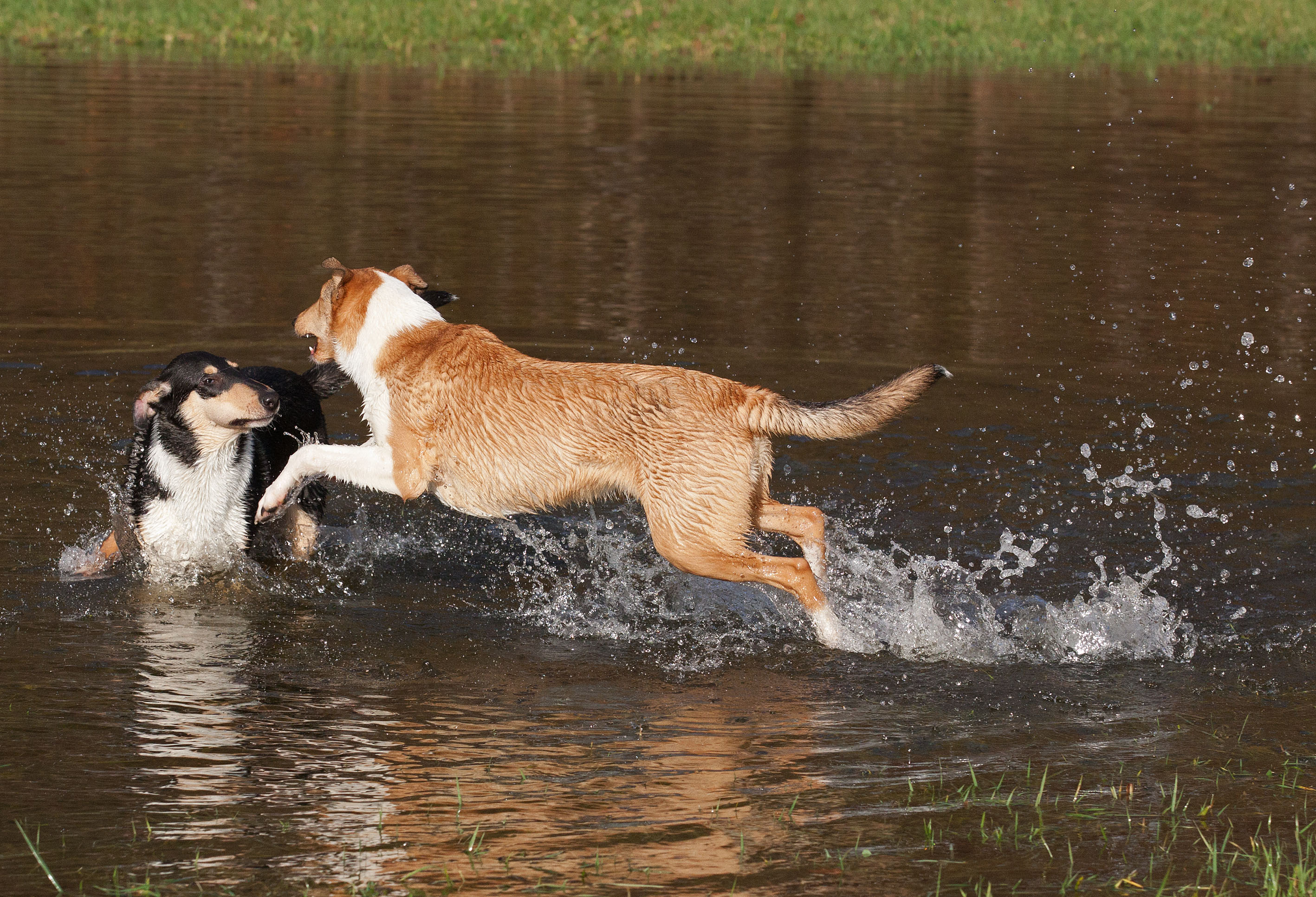 Auf der Wiese hat sich ein kleiner Teich gebildet und die Hunde,