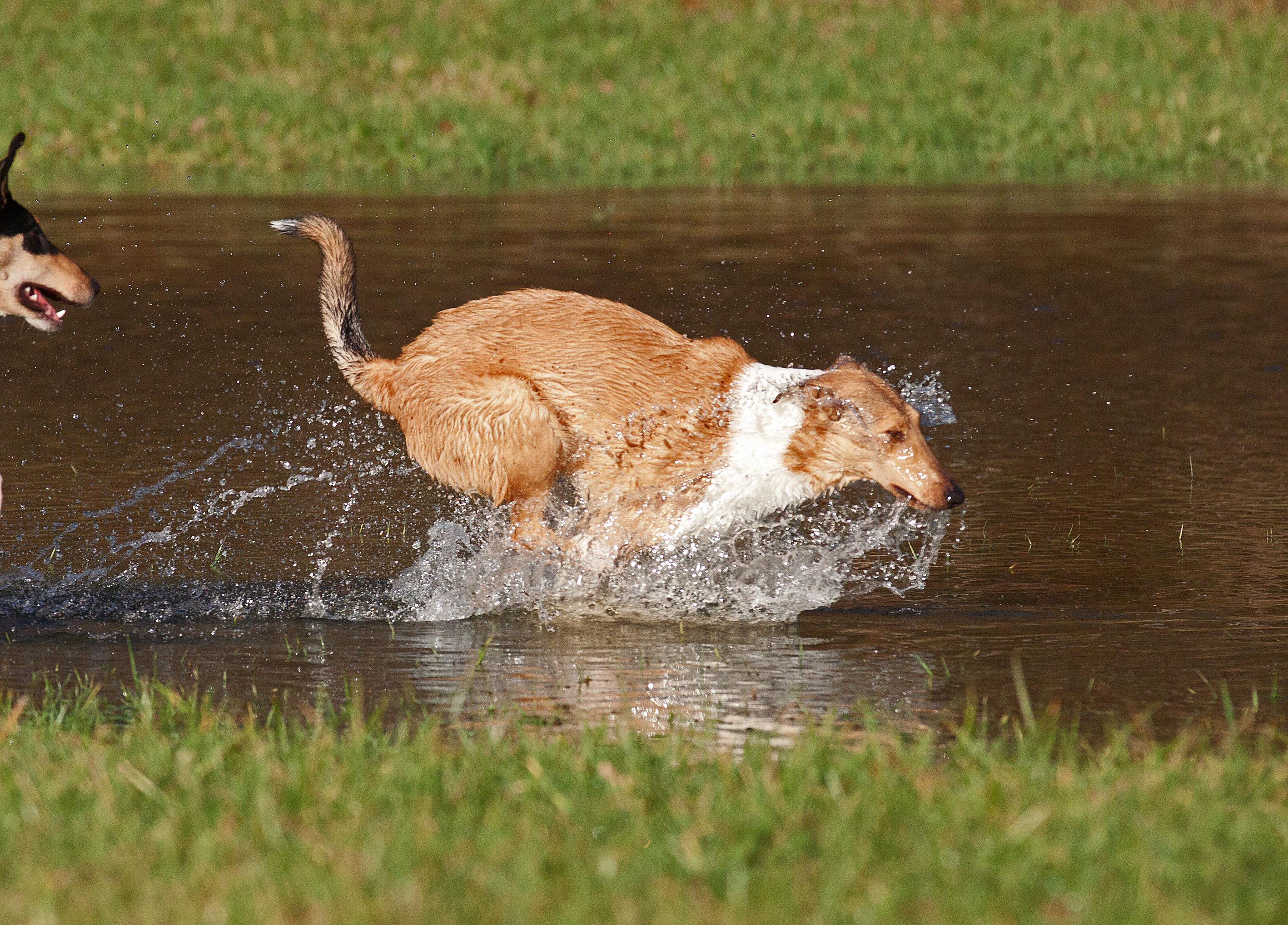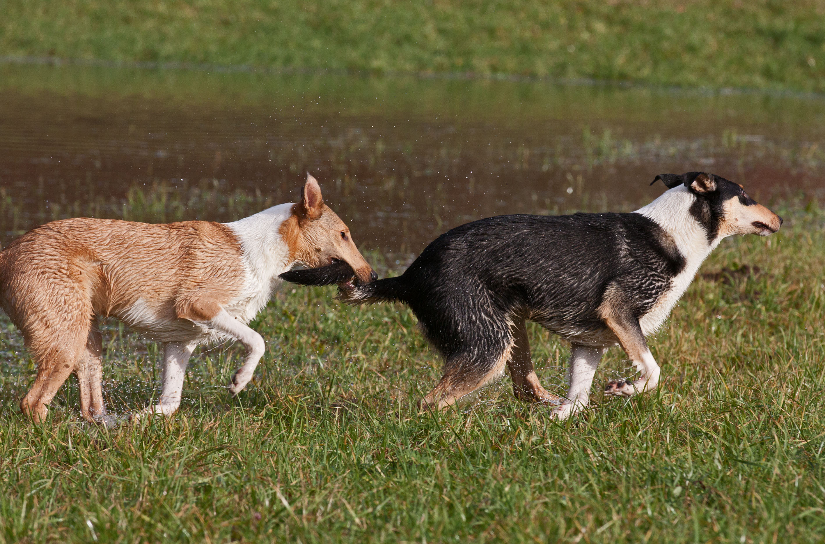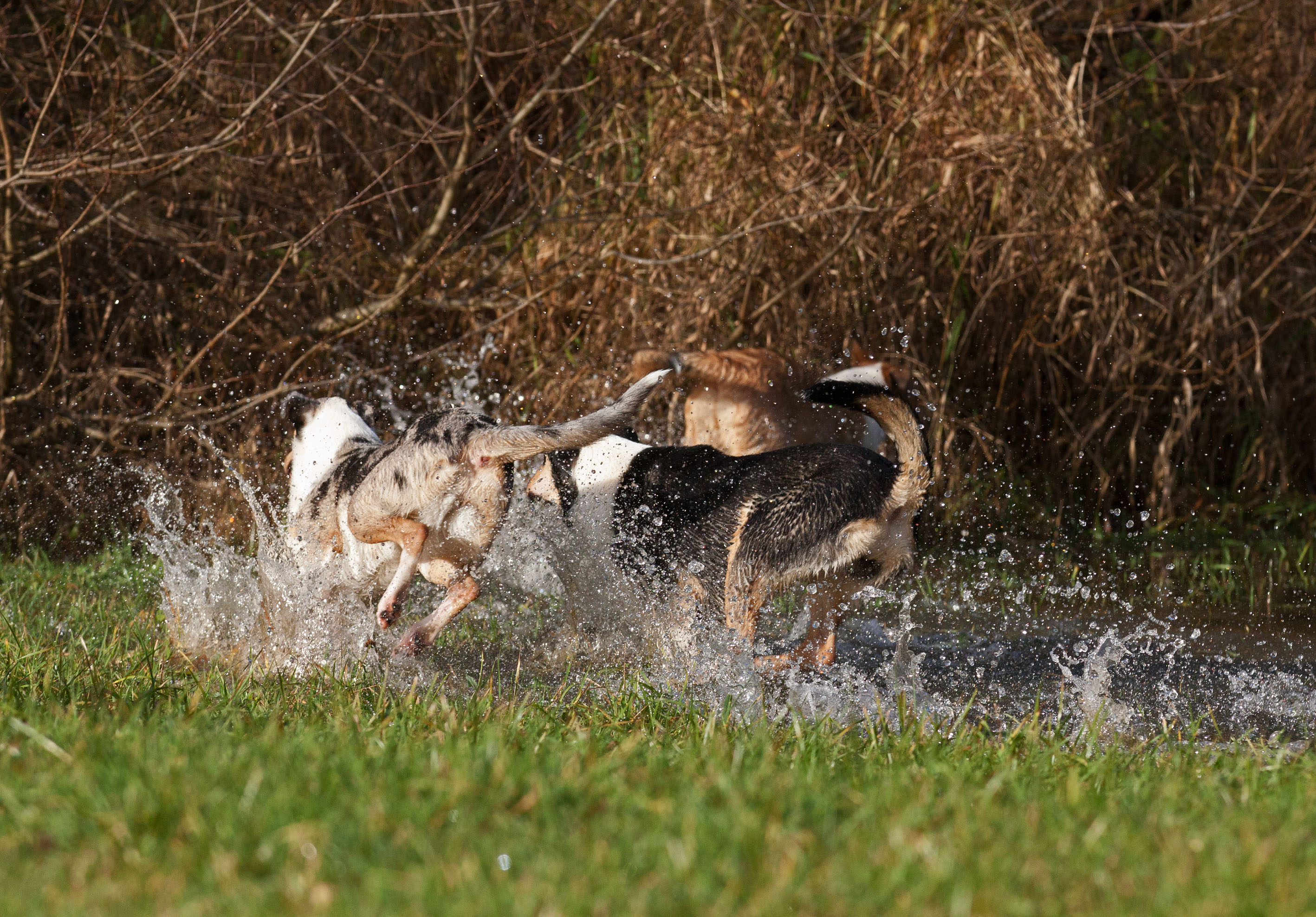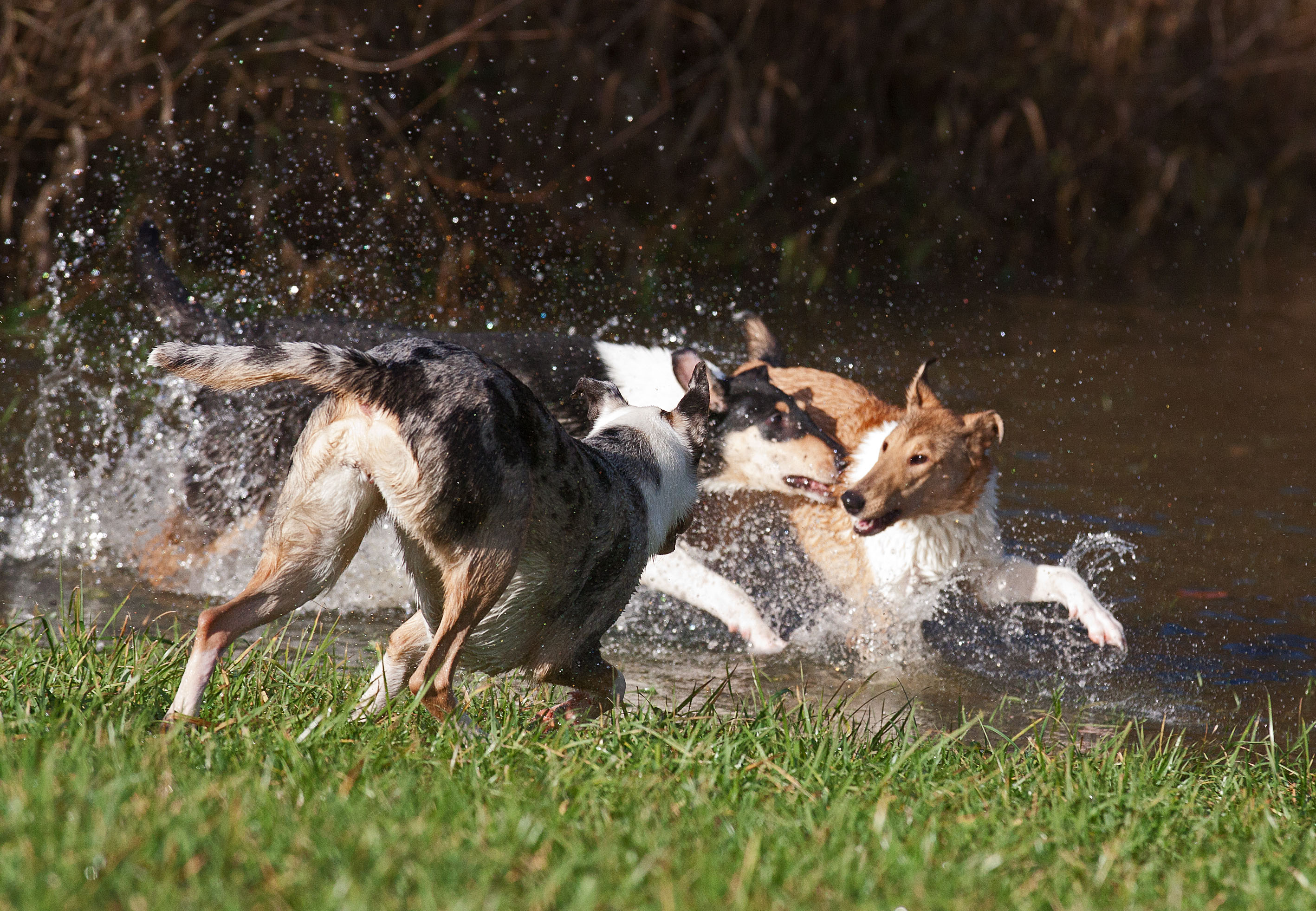 Auf der Wiese hat sich ein kleiner Teich gebildet und die Hunde,