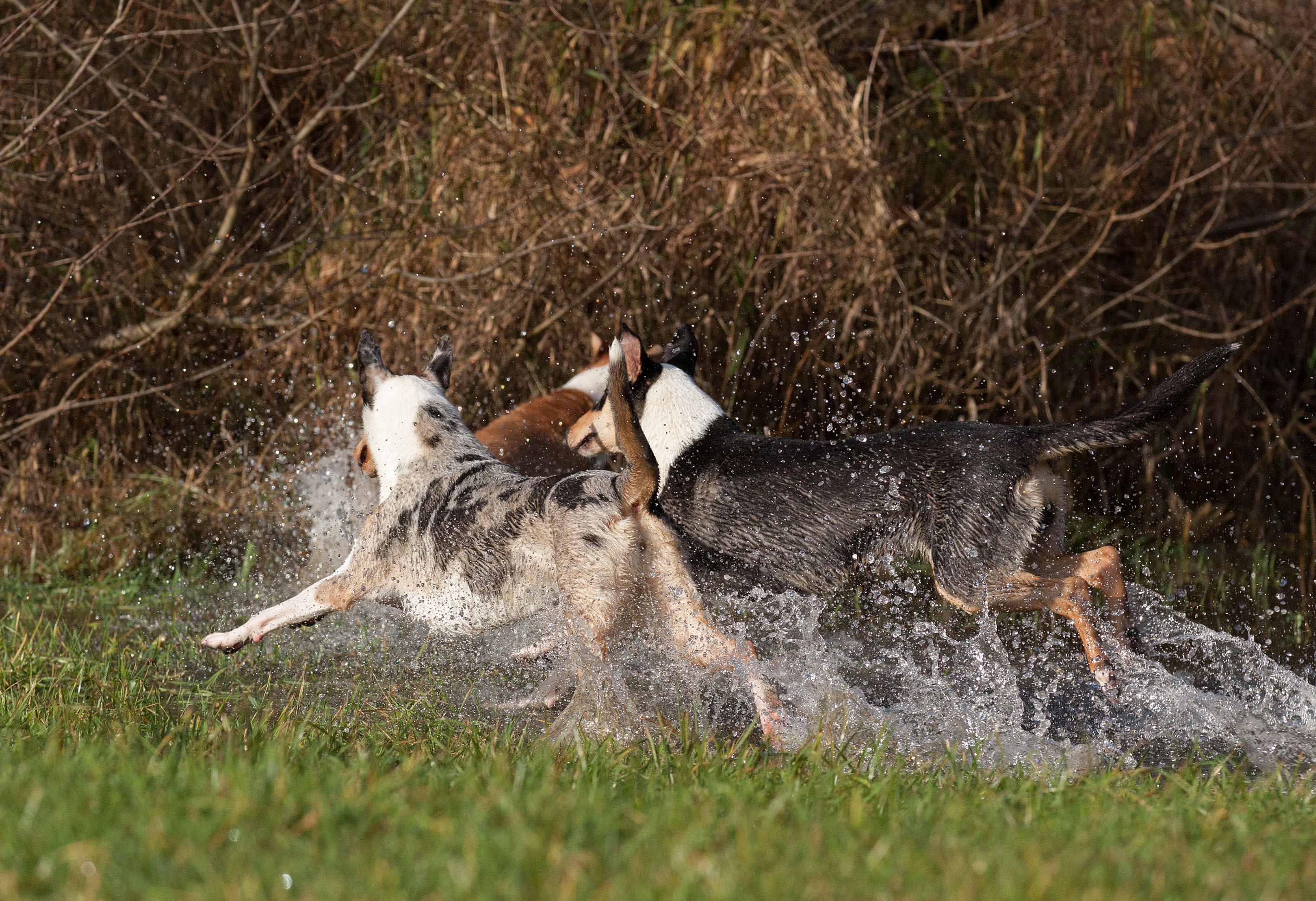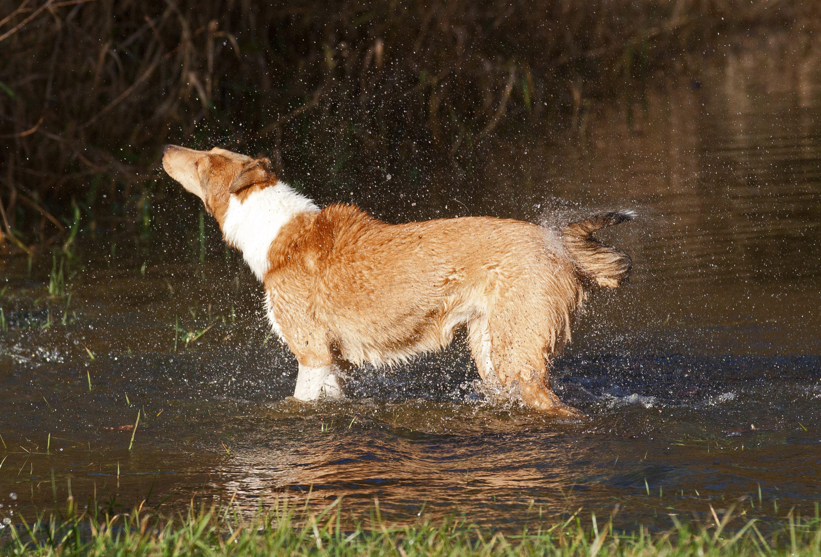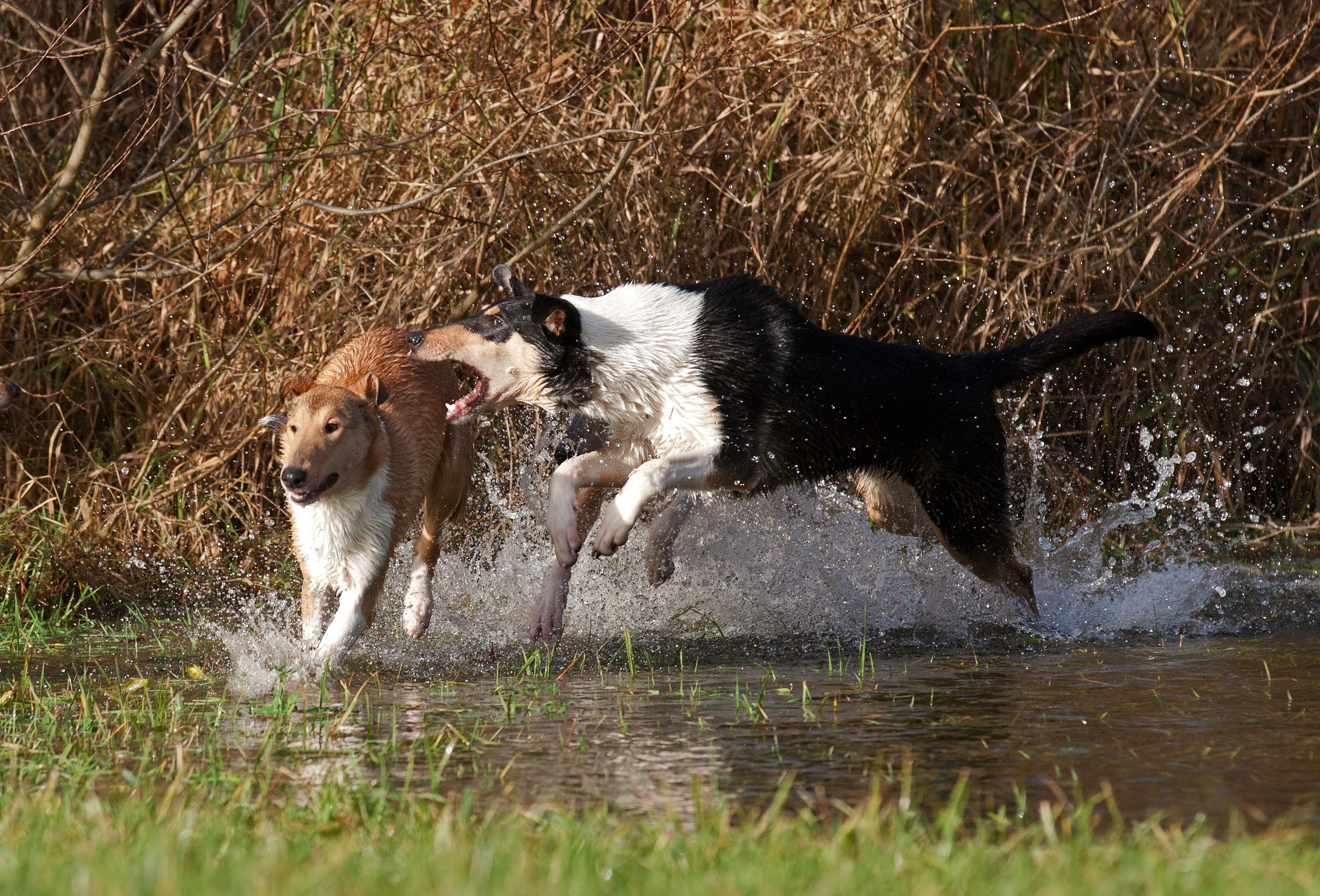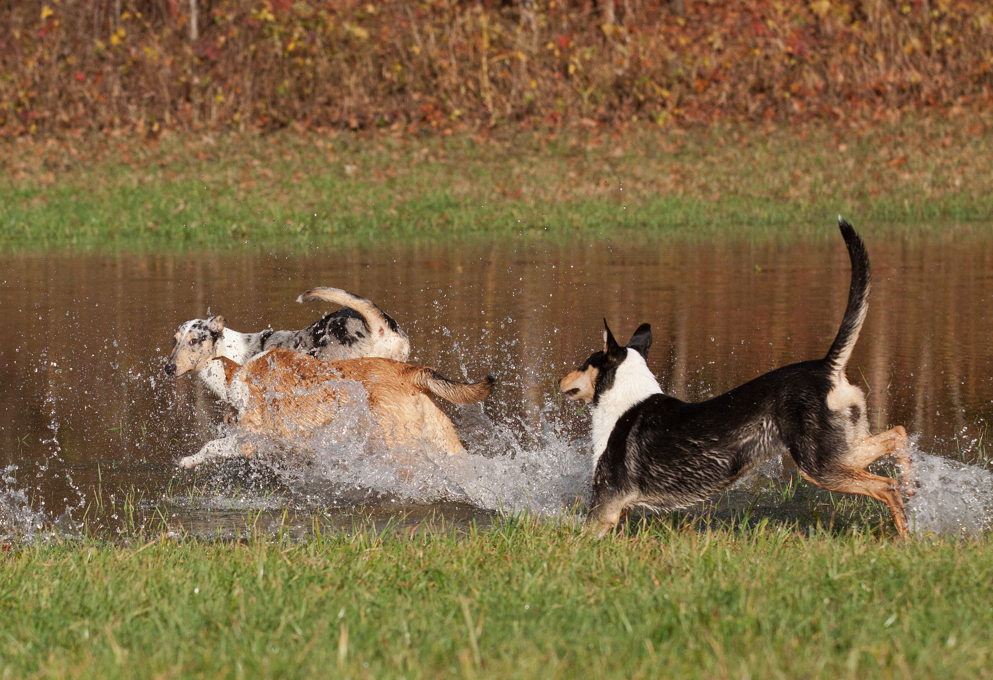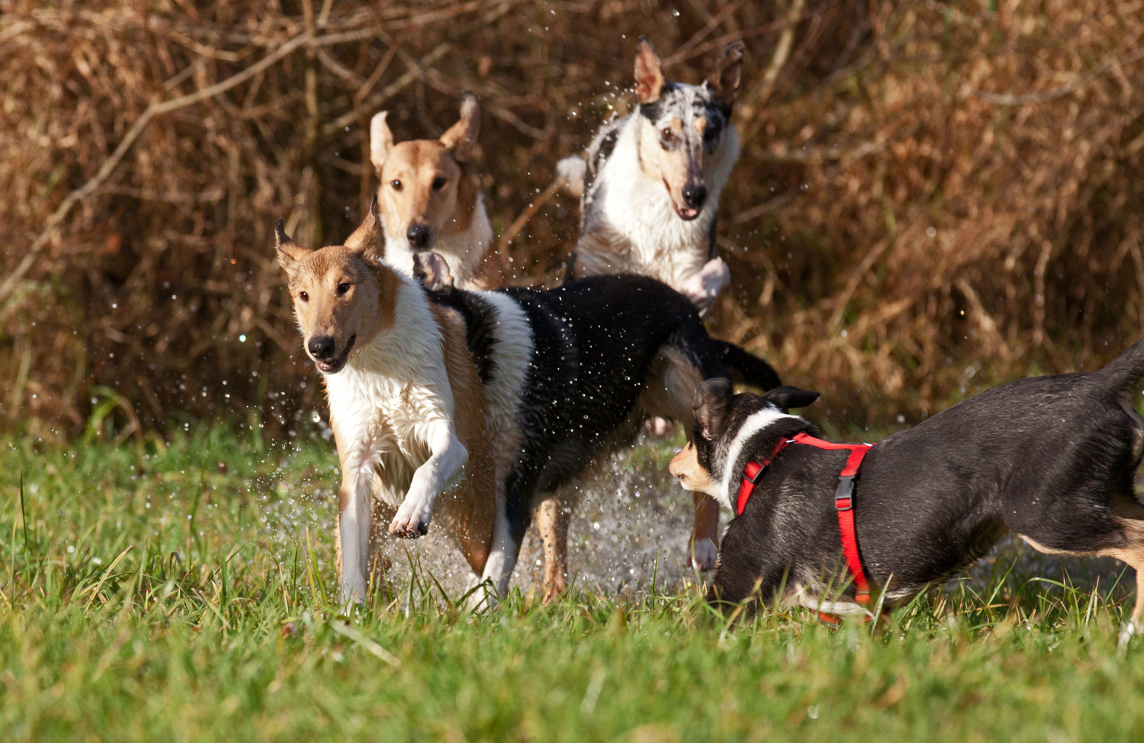 Auf der Wiese hat sich ein kleiner Teich gebildet und die Hunde,
