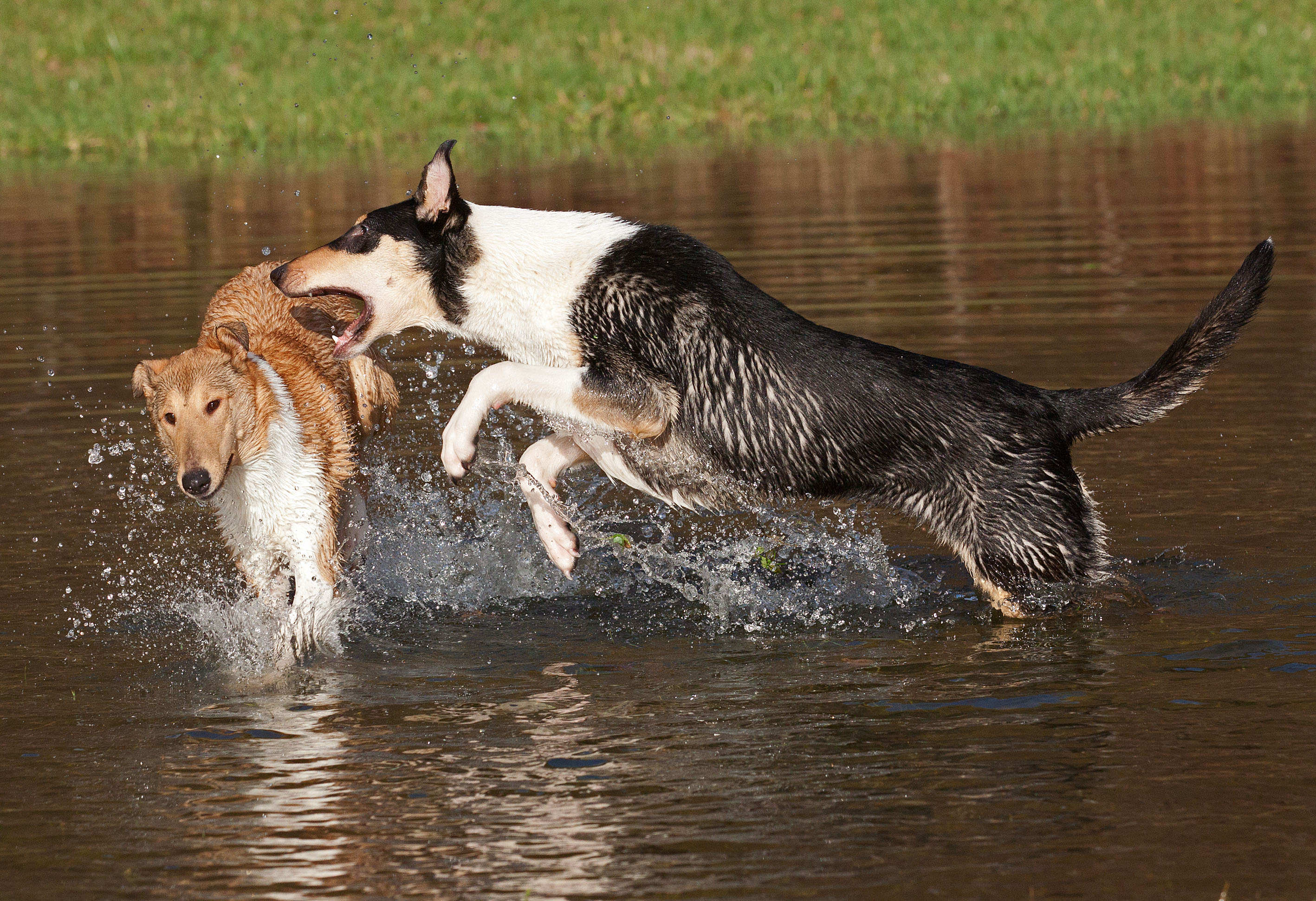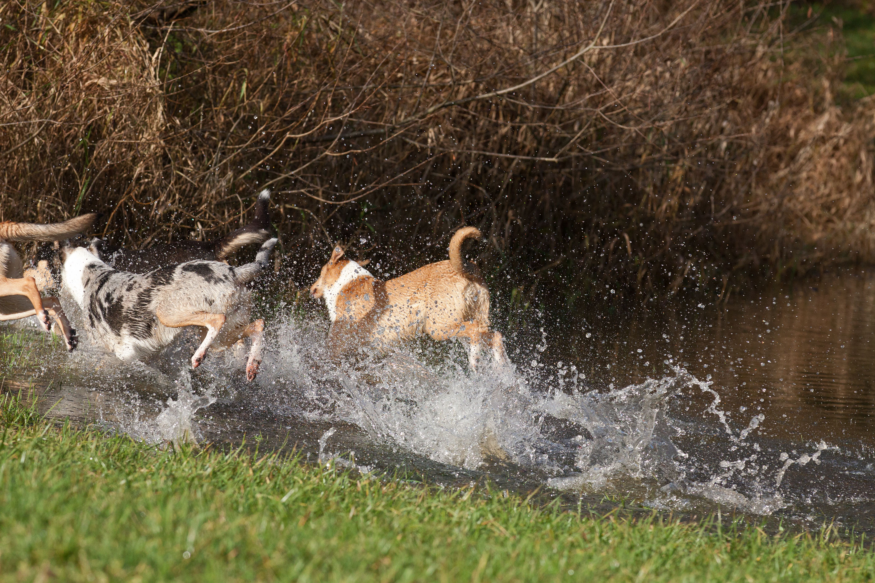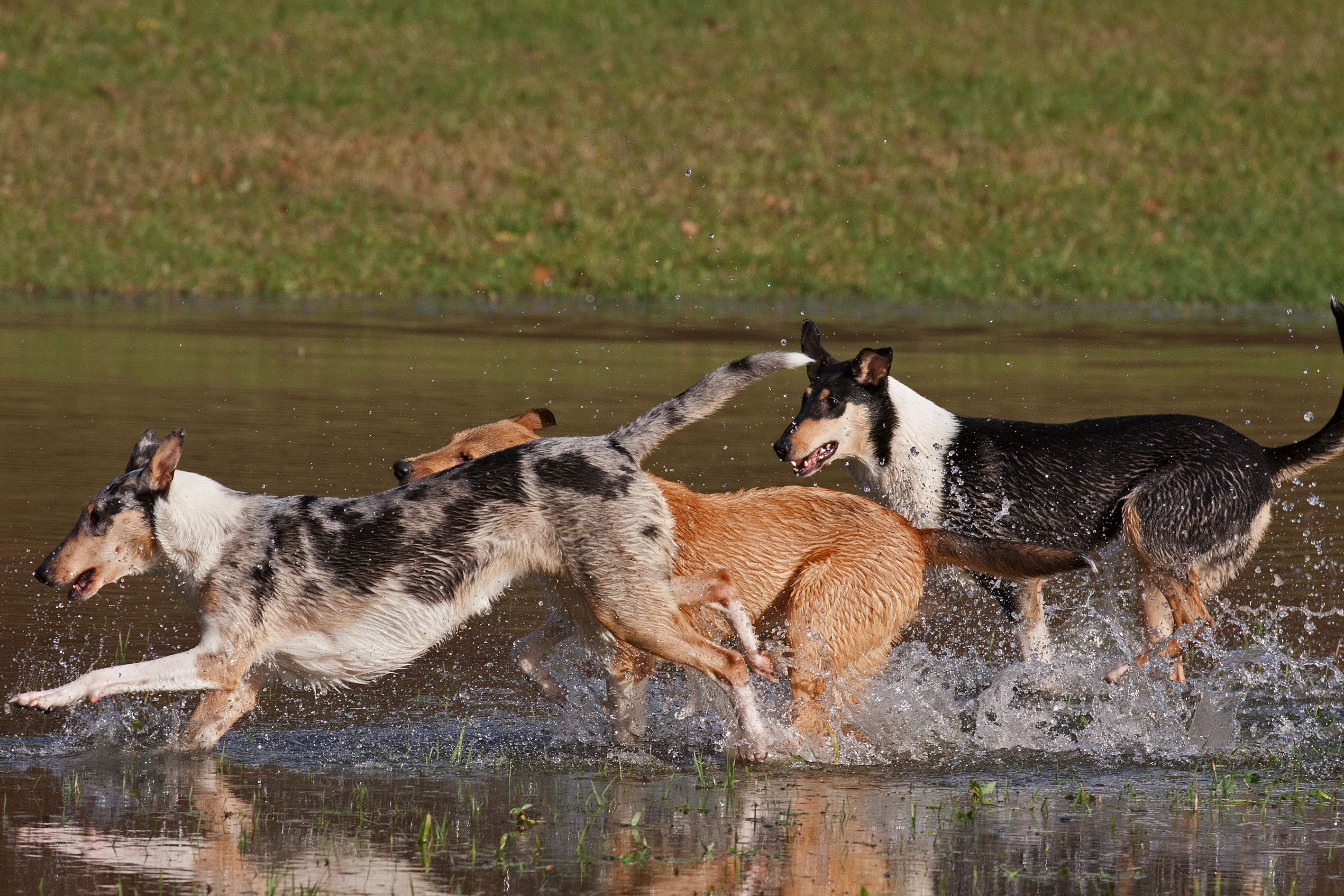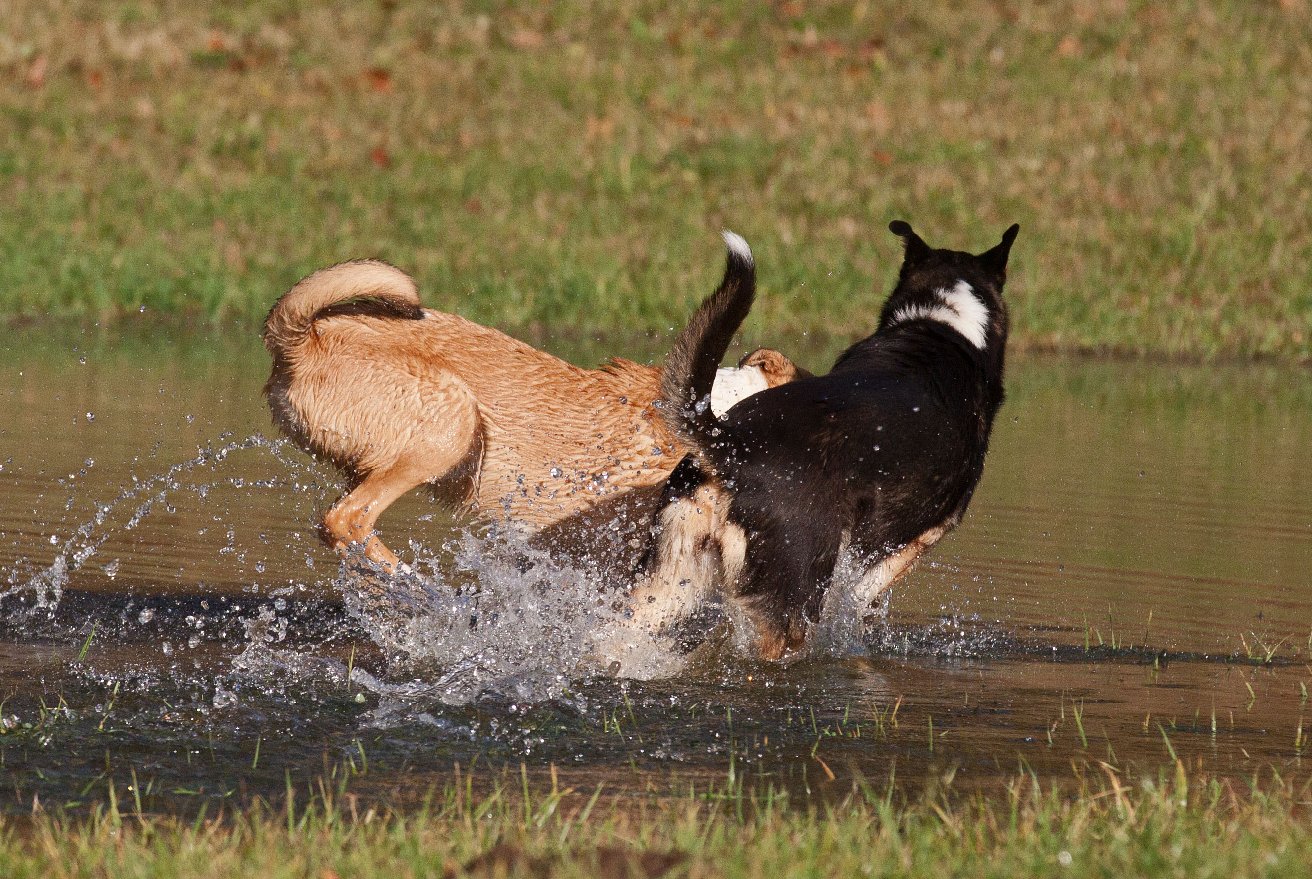 Auf der Wiese hat sich ein kleiner Teich gebildet und die Hunde,