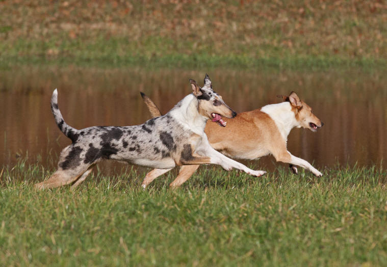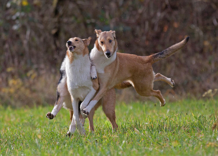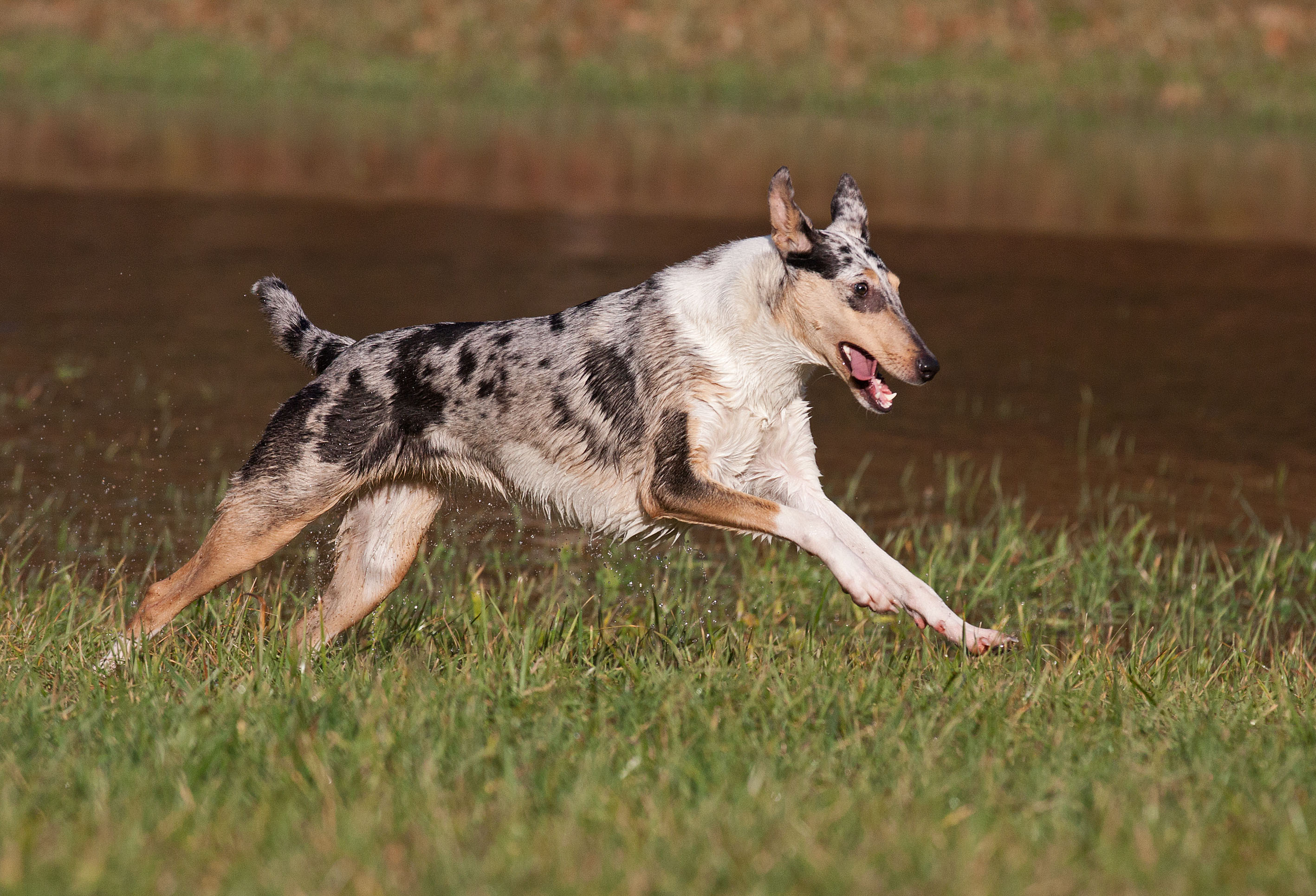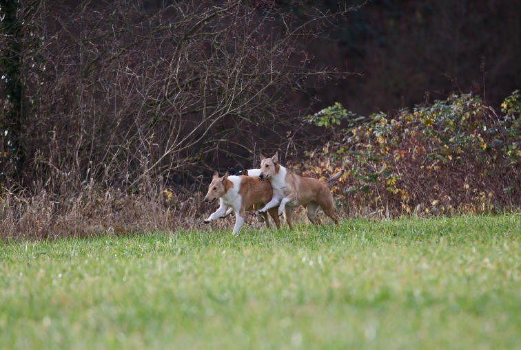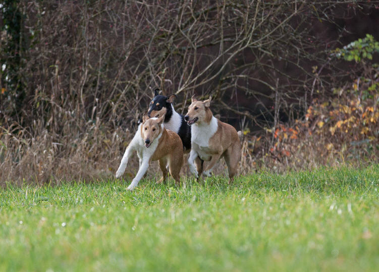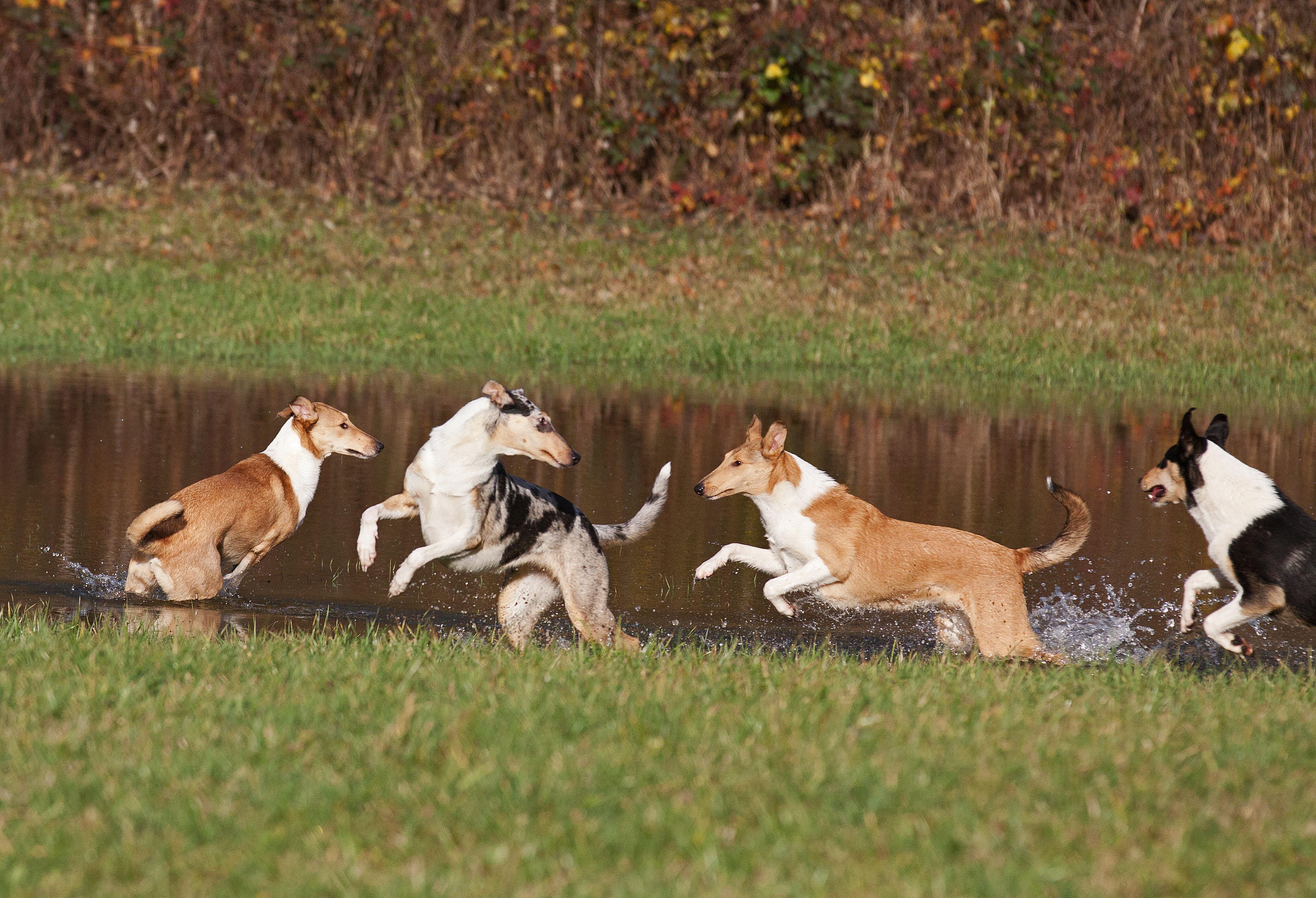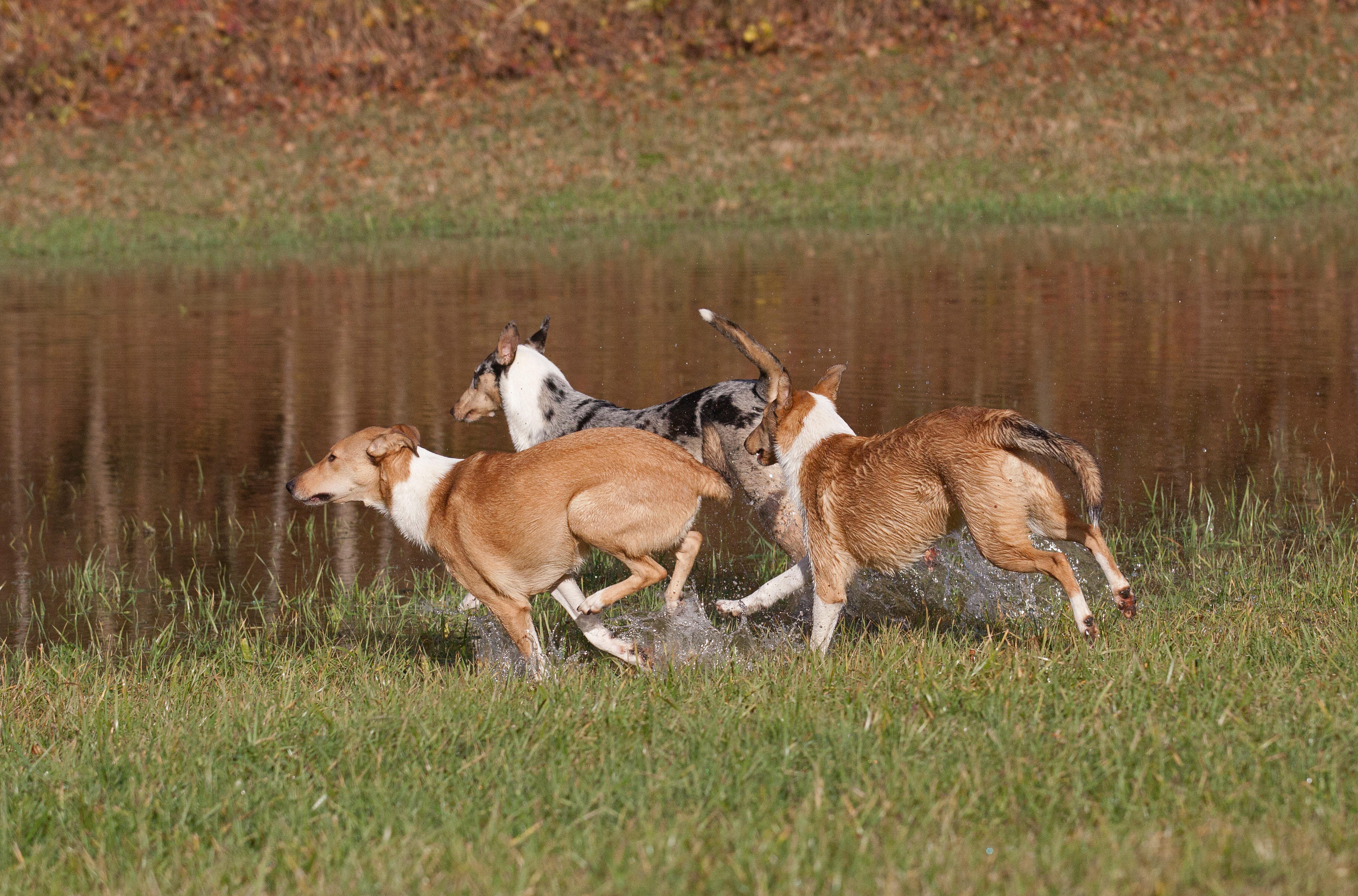 Auf der Wiese hat sich ein kleiner Teich gebildet und die Hunde,