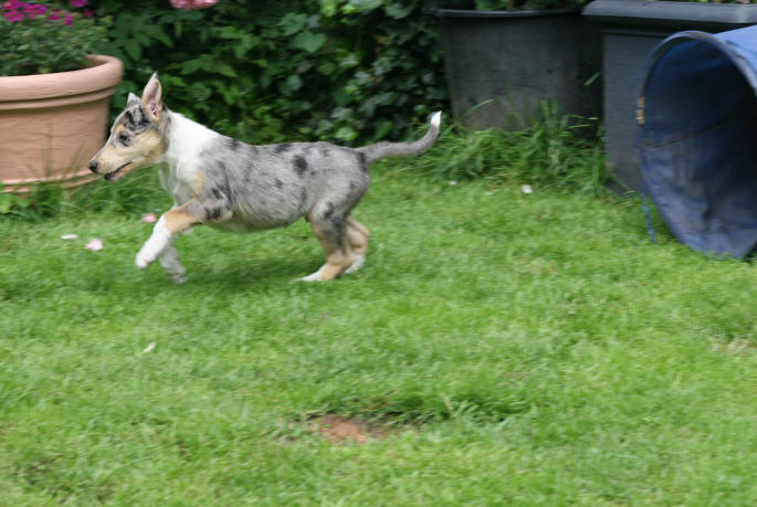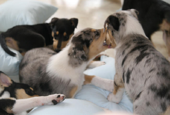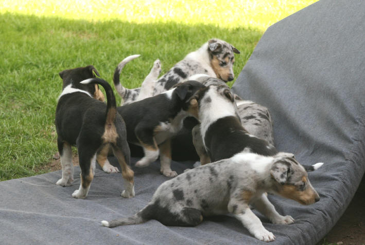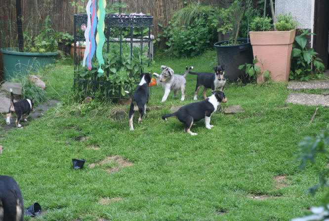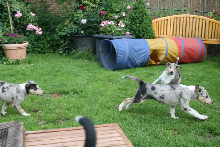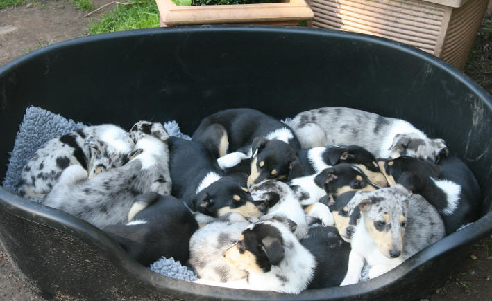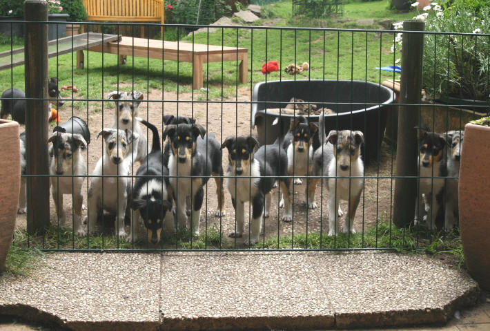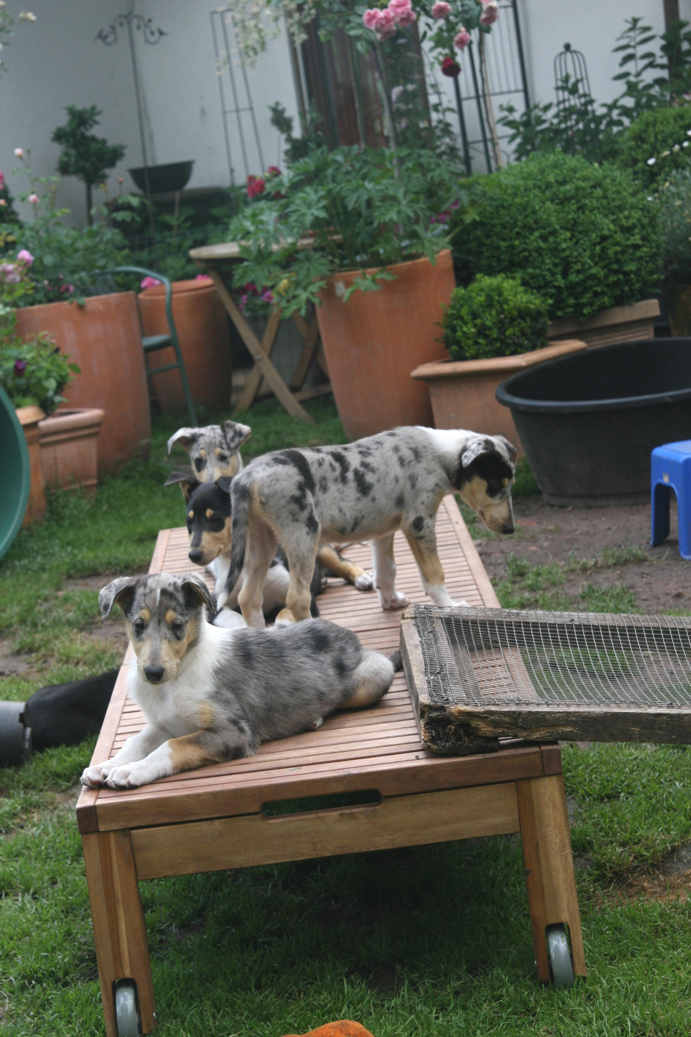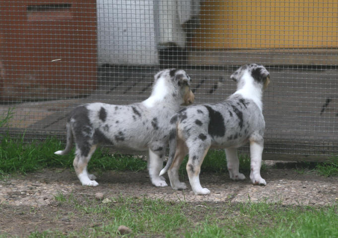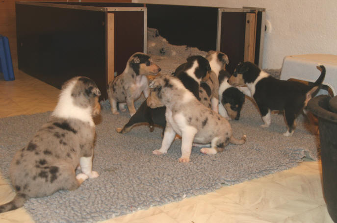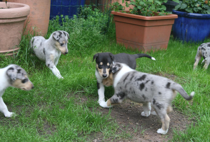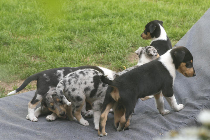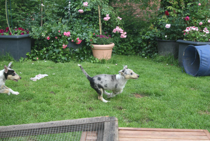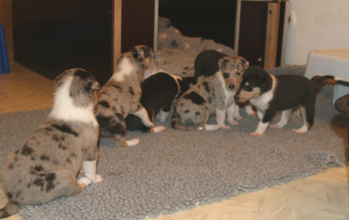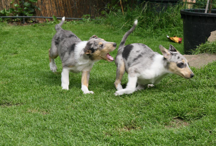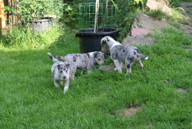 ( Chunky Monkey van Shaka's Royal Kraal x Ch. Rainybanks Summer Night ) Wurftag 26.04.2009 2 tricolour Rüden, 1 blue merle Rüde, 1 tricolour Hündin, 3 blue merle Hündinnen |