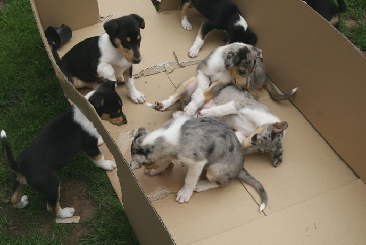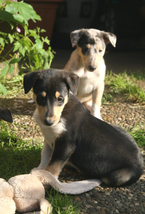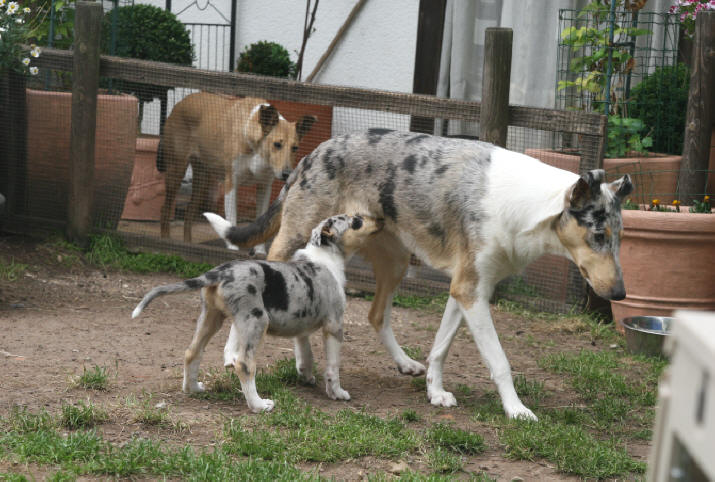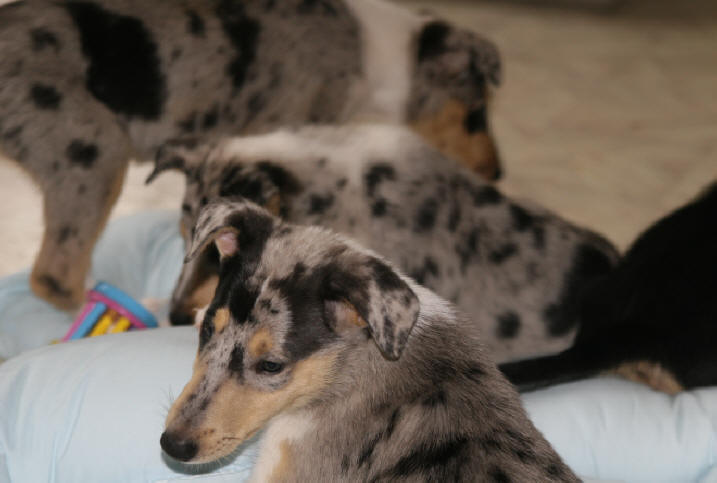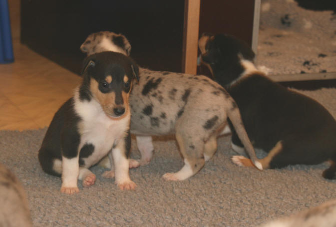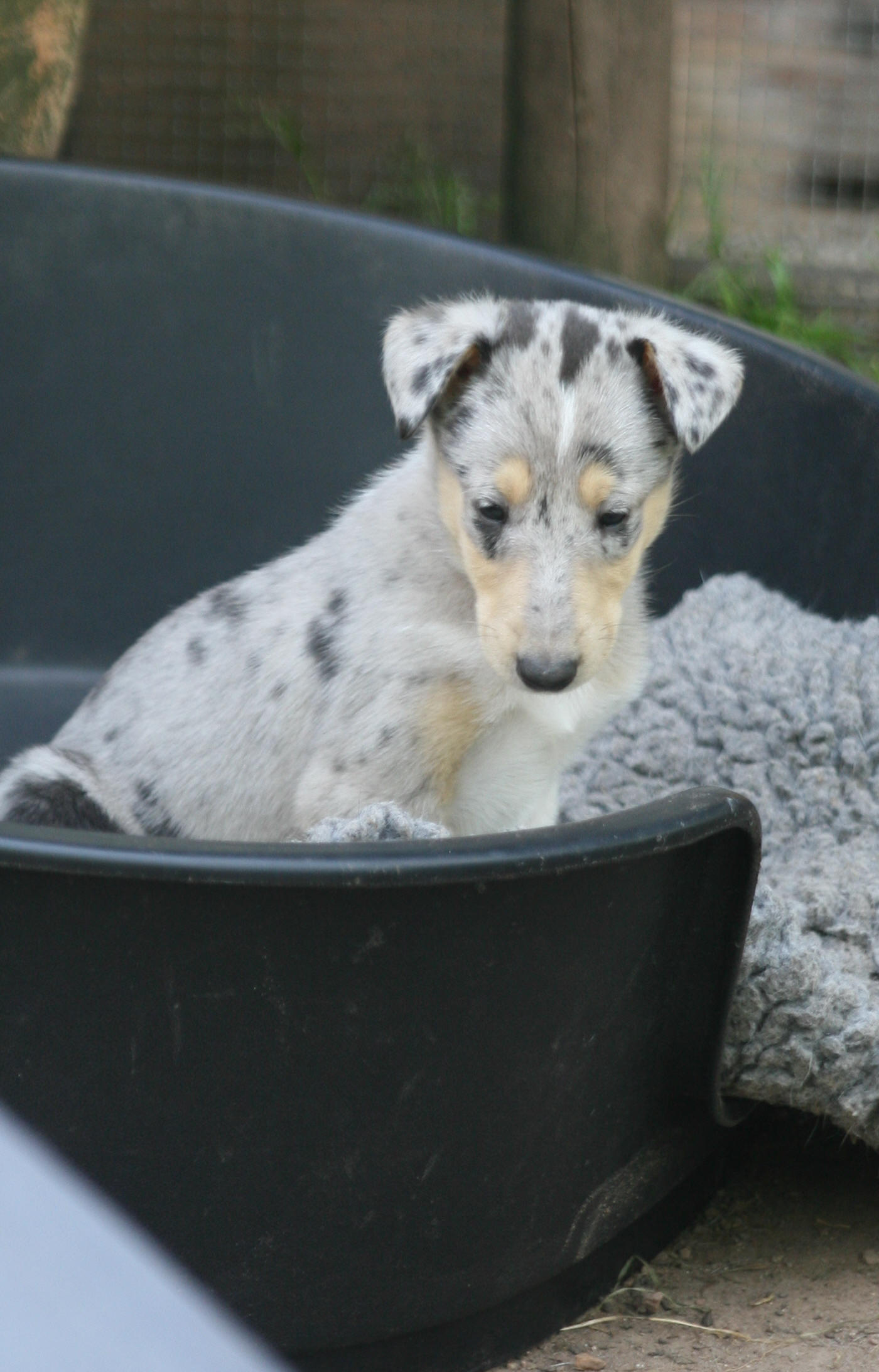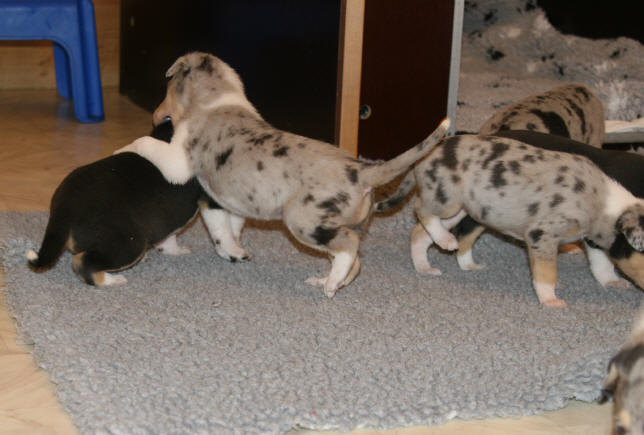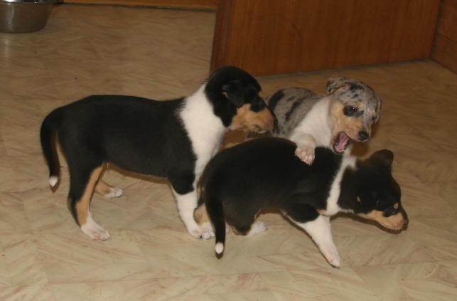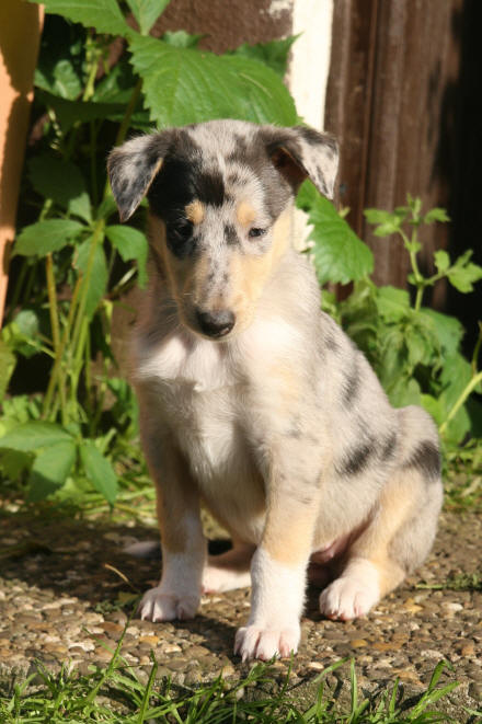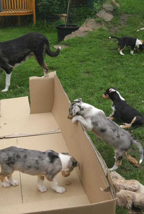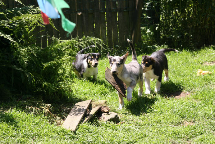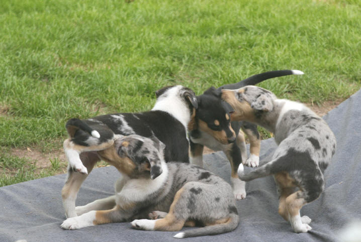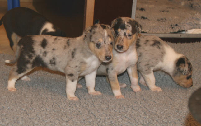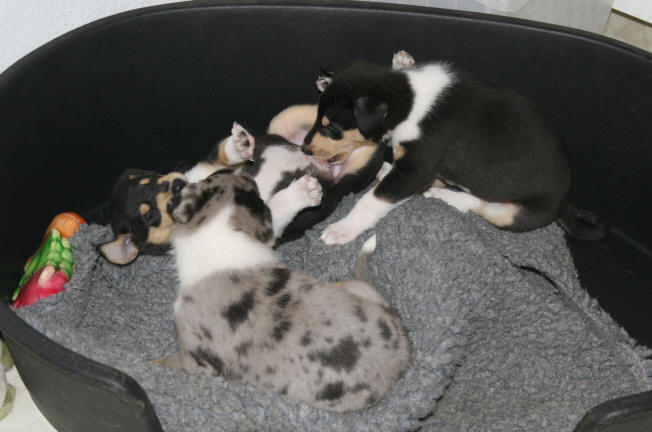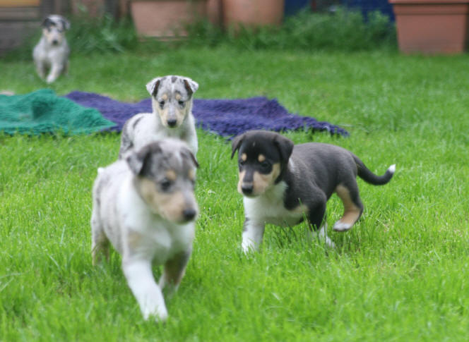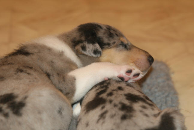 ( Chunky Monkey van Shaka's Royal Kraal x Ch. Rainybanks Summer Night ) Wurftag 26.04.2009 2 tricolour Rüden, 1 blue merle Rüde, 1 tricolour Hündin, 3 blue merle Hündinnen |