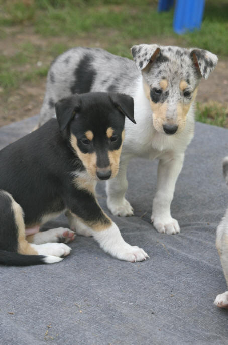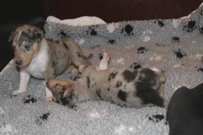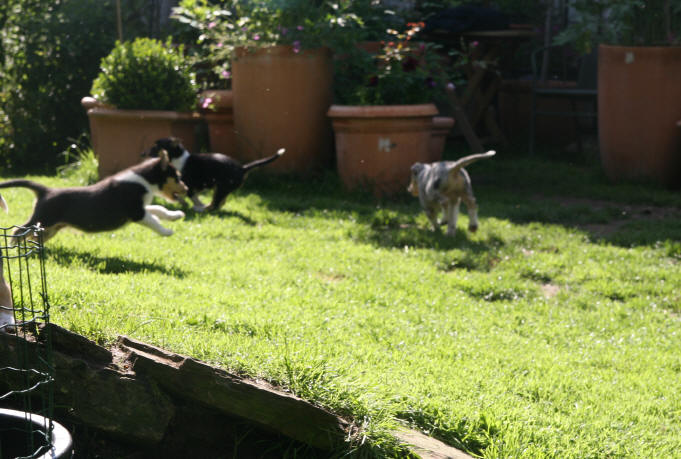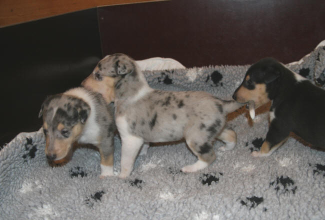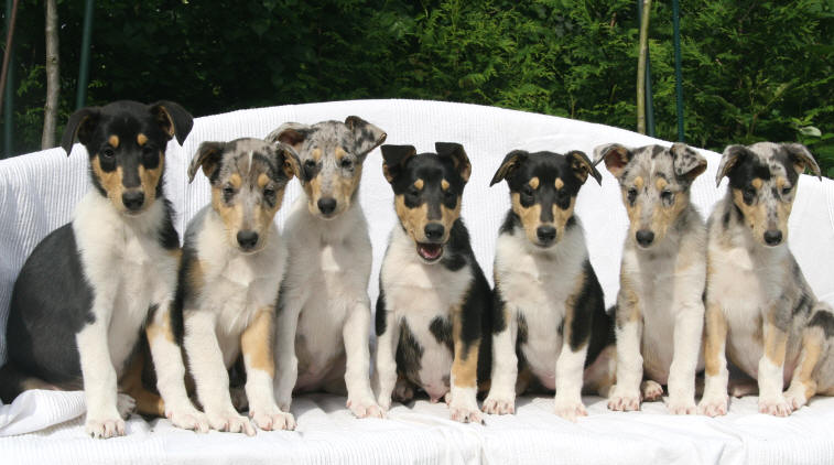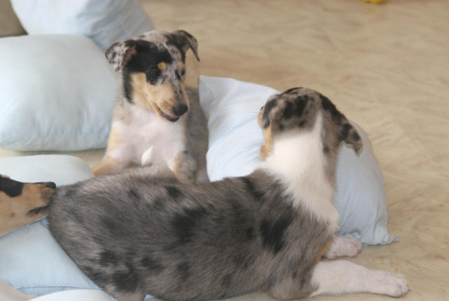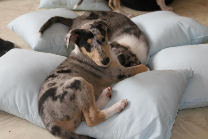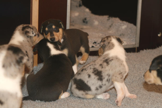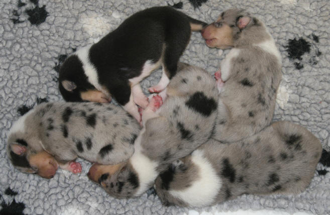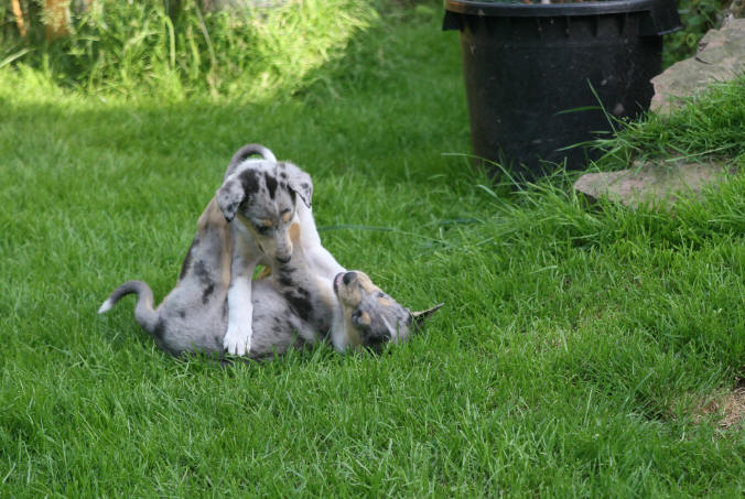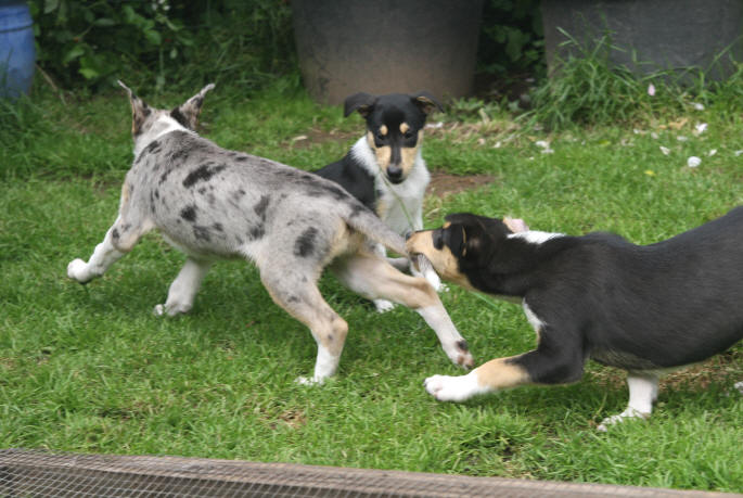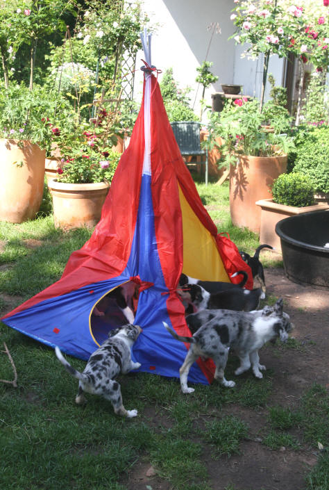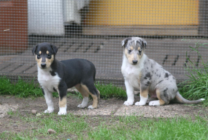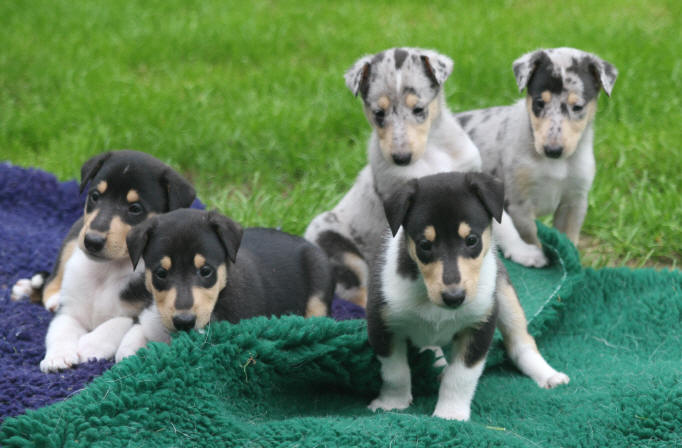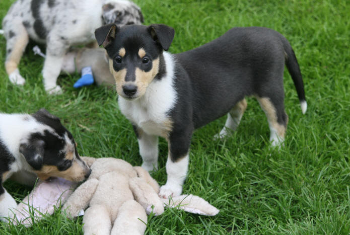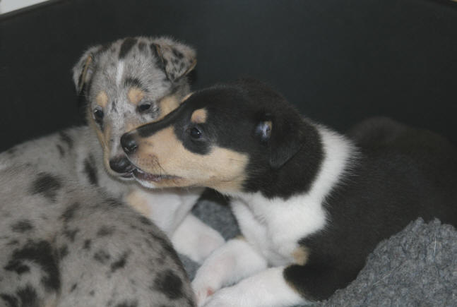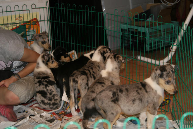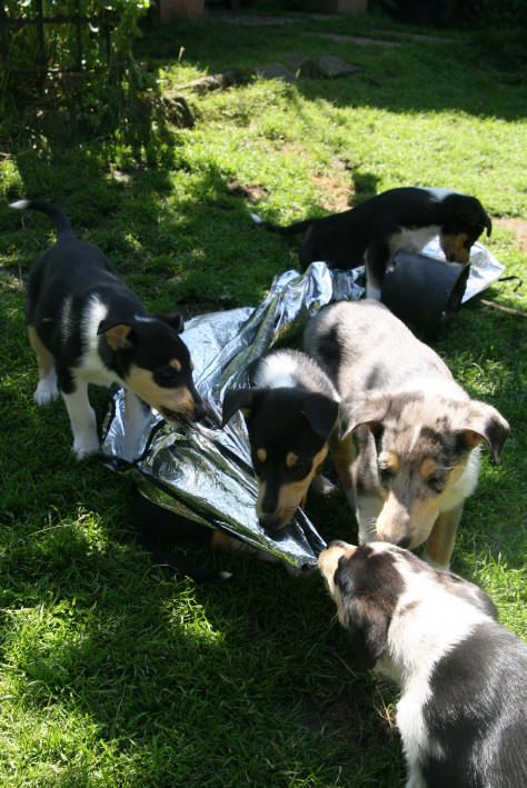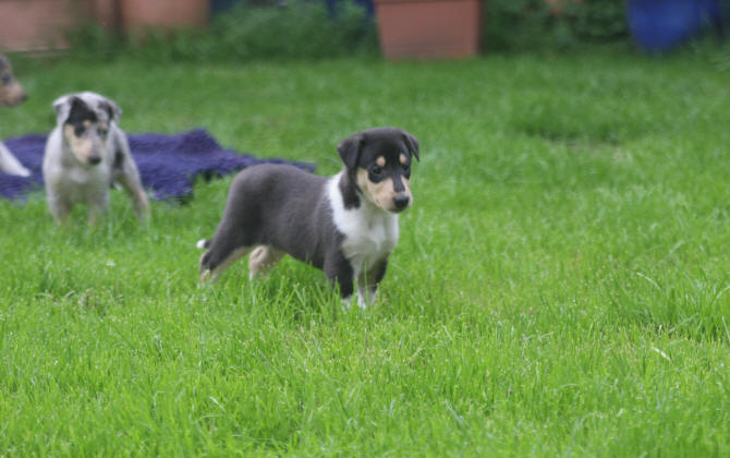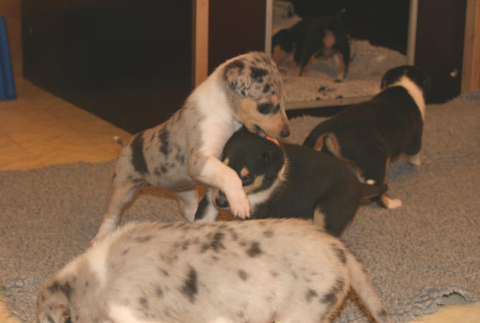 ( Chunky Monkey van Shaka's Royal Kraal x Ch. Rainybanks Summer Night ) Wurftag 26.04.2009 2 tricolour Rüden, 1 blue merle Rüde, 1 tricolour Hündin, 3 blue merle Hündinnen |