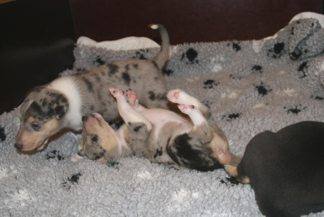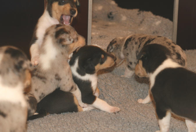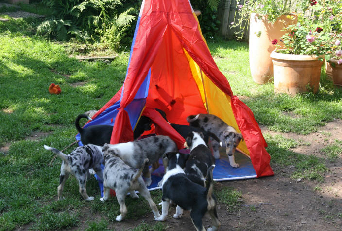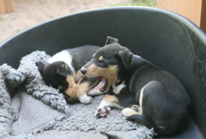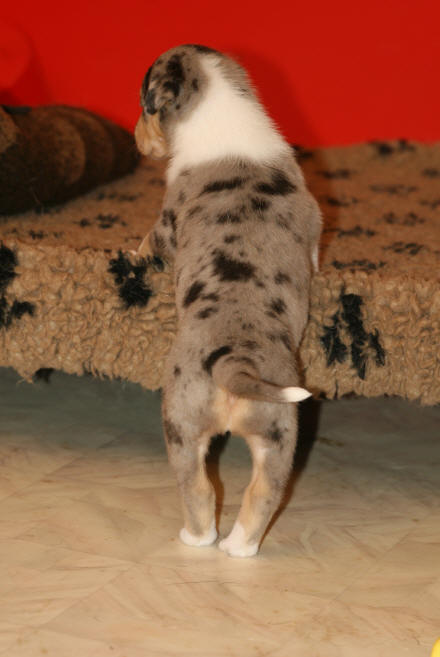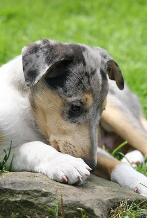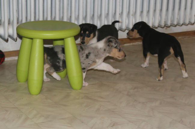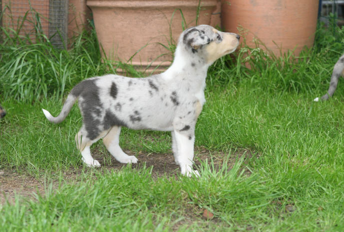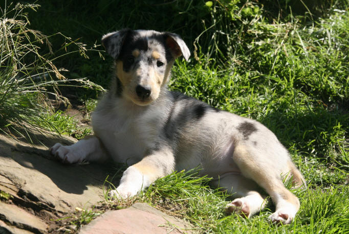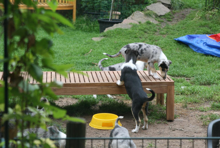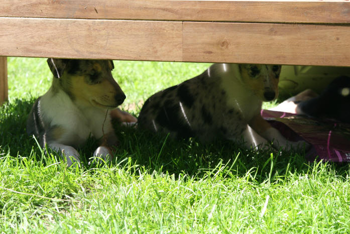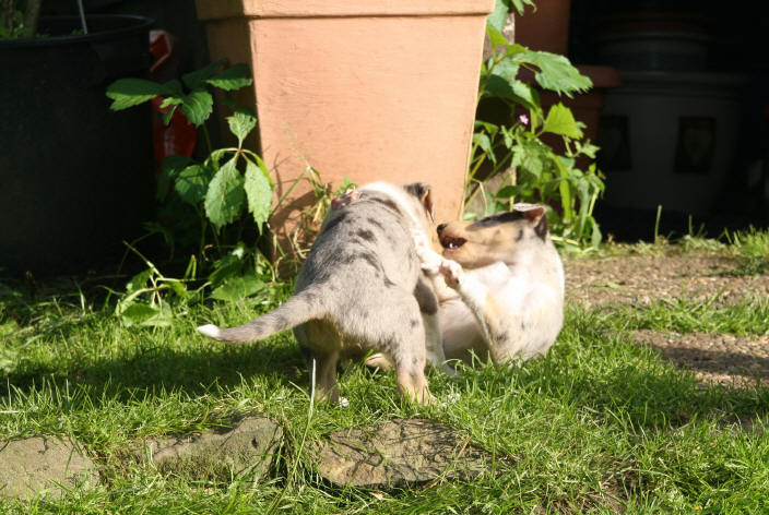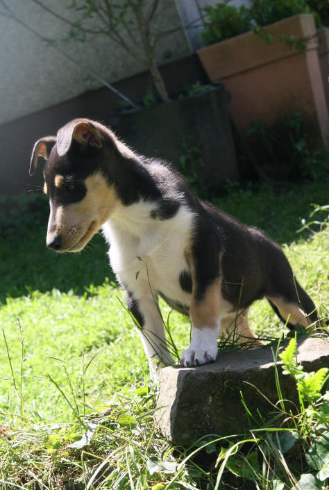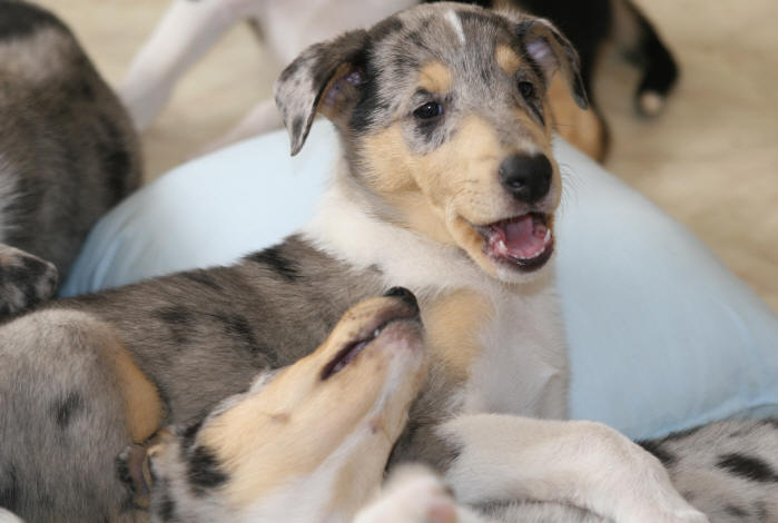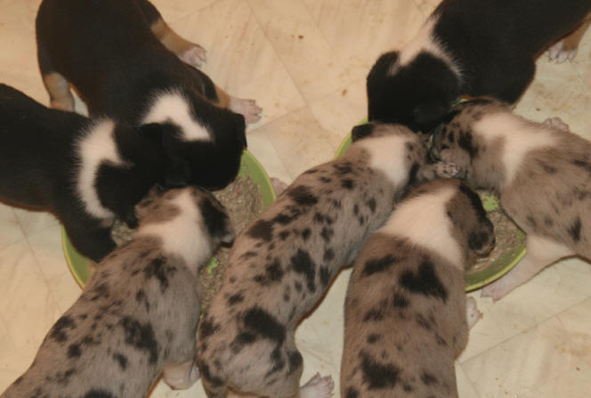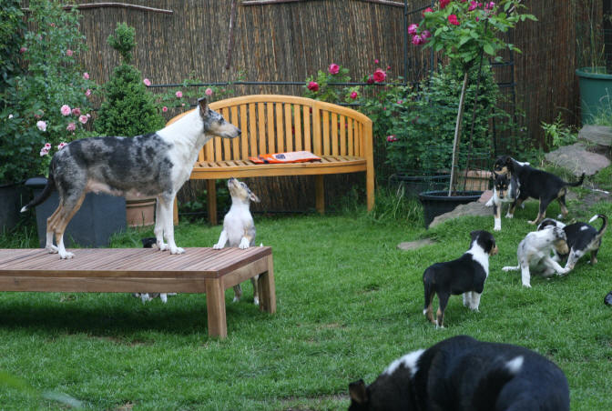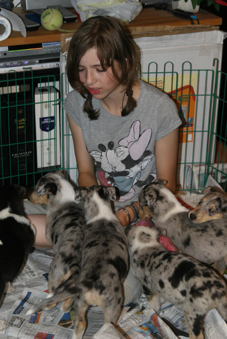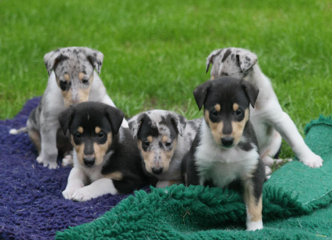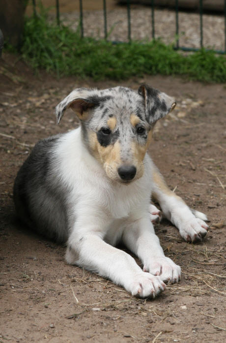 ( Chunky Monkey van Shaka's Royal Kraal x Ch. Rainybanks Summer Night ) Wurftag 26.04.2009 2 tricolour Rüden, 1 blue merle Rüde, 1 tricolour Hündin, 3 blue merle Hündinnen |