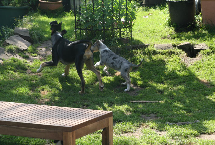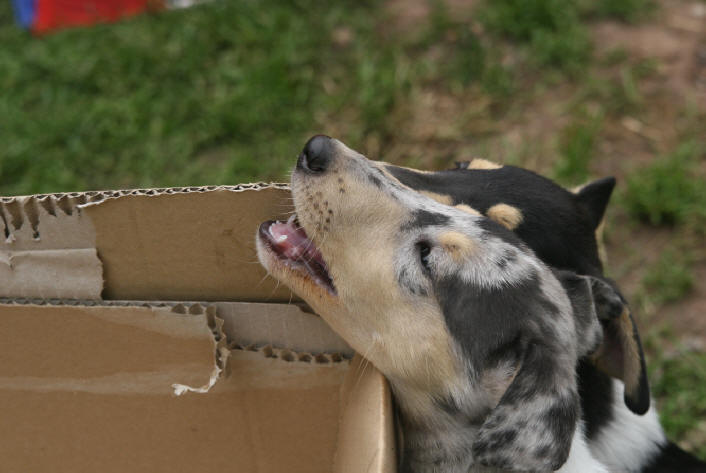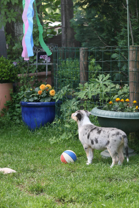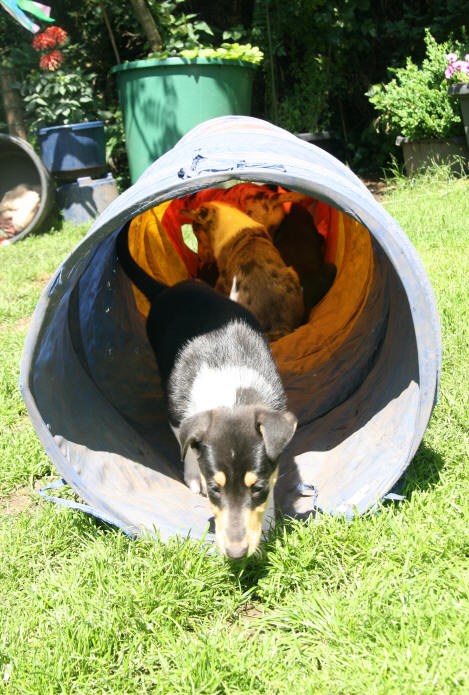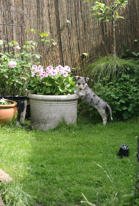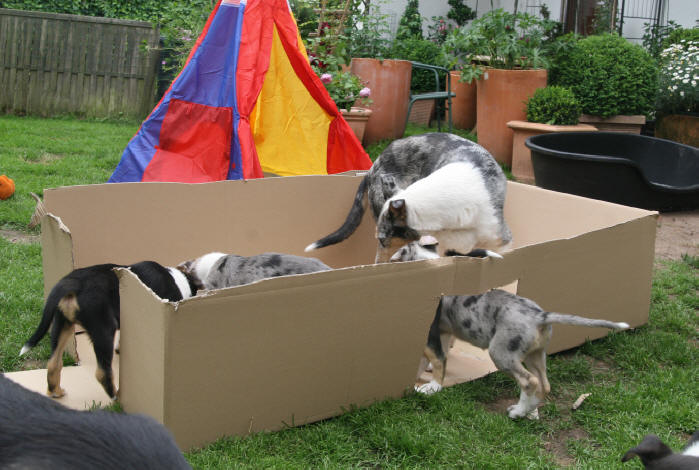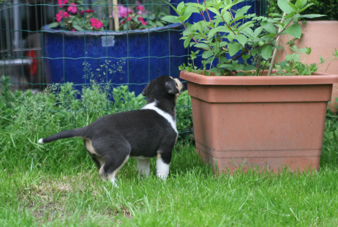27.05.09 Ein gutes Stück gewachsen. Die Welpen dürfen das erste Grün beschnuppern.