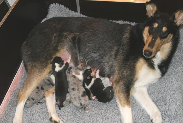 Die Welpen sind da !! Geboren am 29.04.2009 2 tricolour Rüden, 2 tricolour Hündinen und 2 blue merle Hündinnen