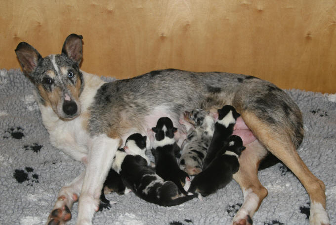 Die Welpen sind da !! Geboren am 26.04.2009 2 tricolour Rüden, 1 blue merle Rüde, 1 tricolour Hündin und 3 blue merle Hündinnen