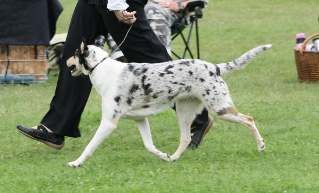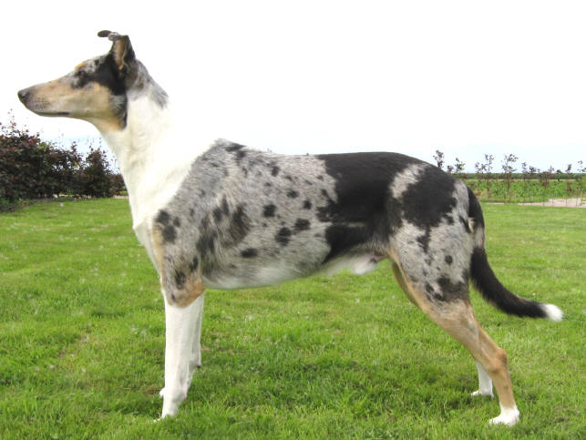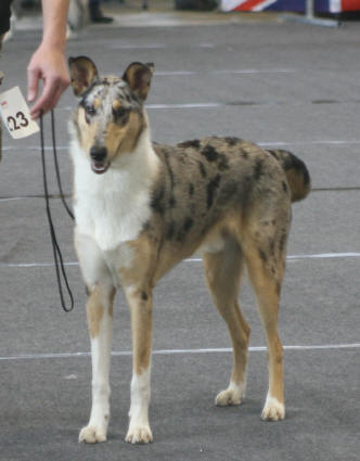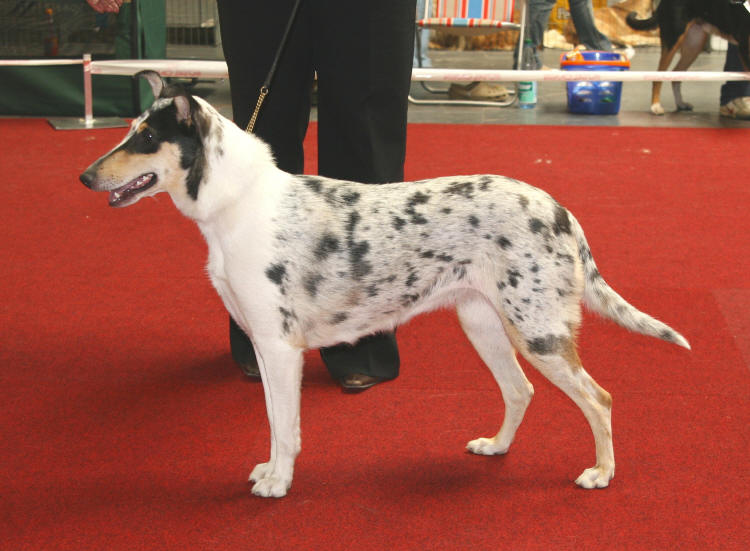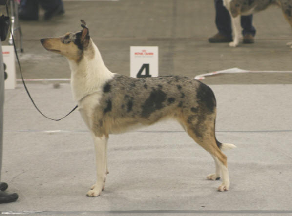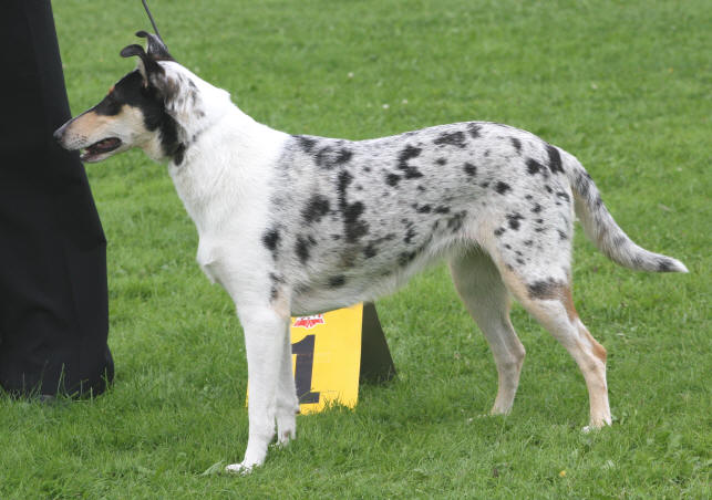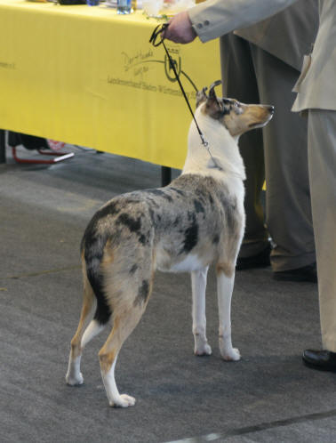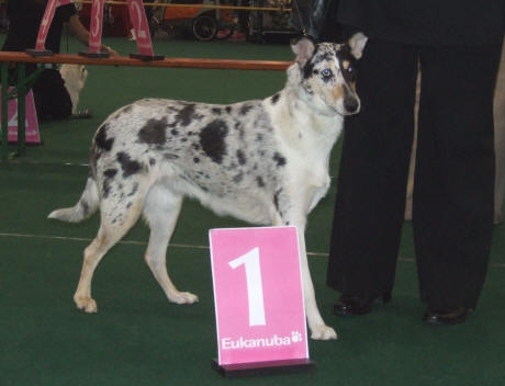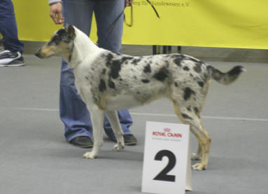 V1, CAC und VDH-CAC für Turella's Vincent - "Yatho" ( Ch. Turella's Prince Charming x Ch. Turella's Royal Velvet ) Besitzer: Janet Mulder & Barend Meulenbeld / NL - Kennel Marakoopa Der Richterbericht : "zweieinhalb Jahre, blue merle,
