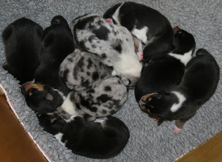 4 tricolour Rüden und 1 blue merle Rüde 2 tricolour Hündinnen und 2 blue merle Hündinnen